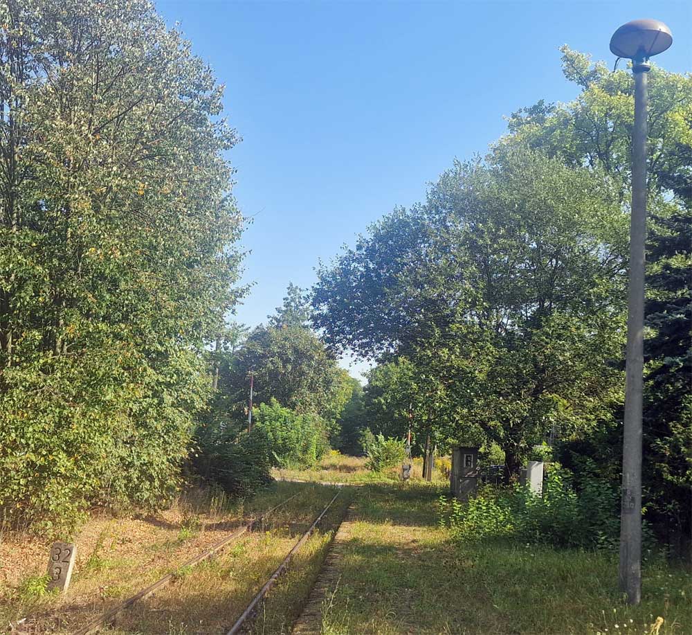 Links abgehend die ehemalige Trasse der Wriezener Bahn