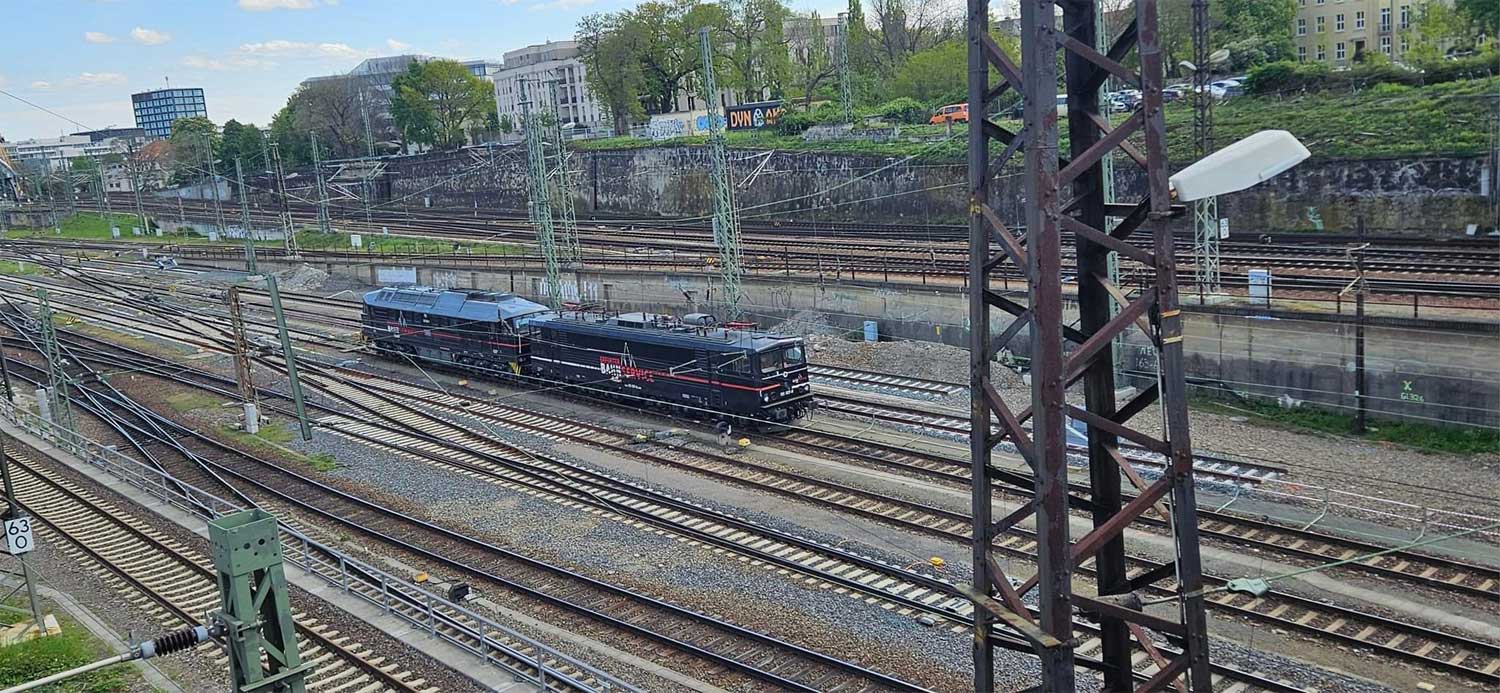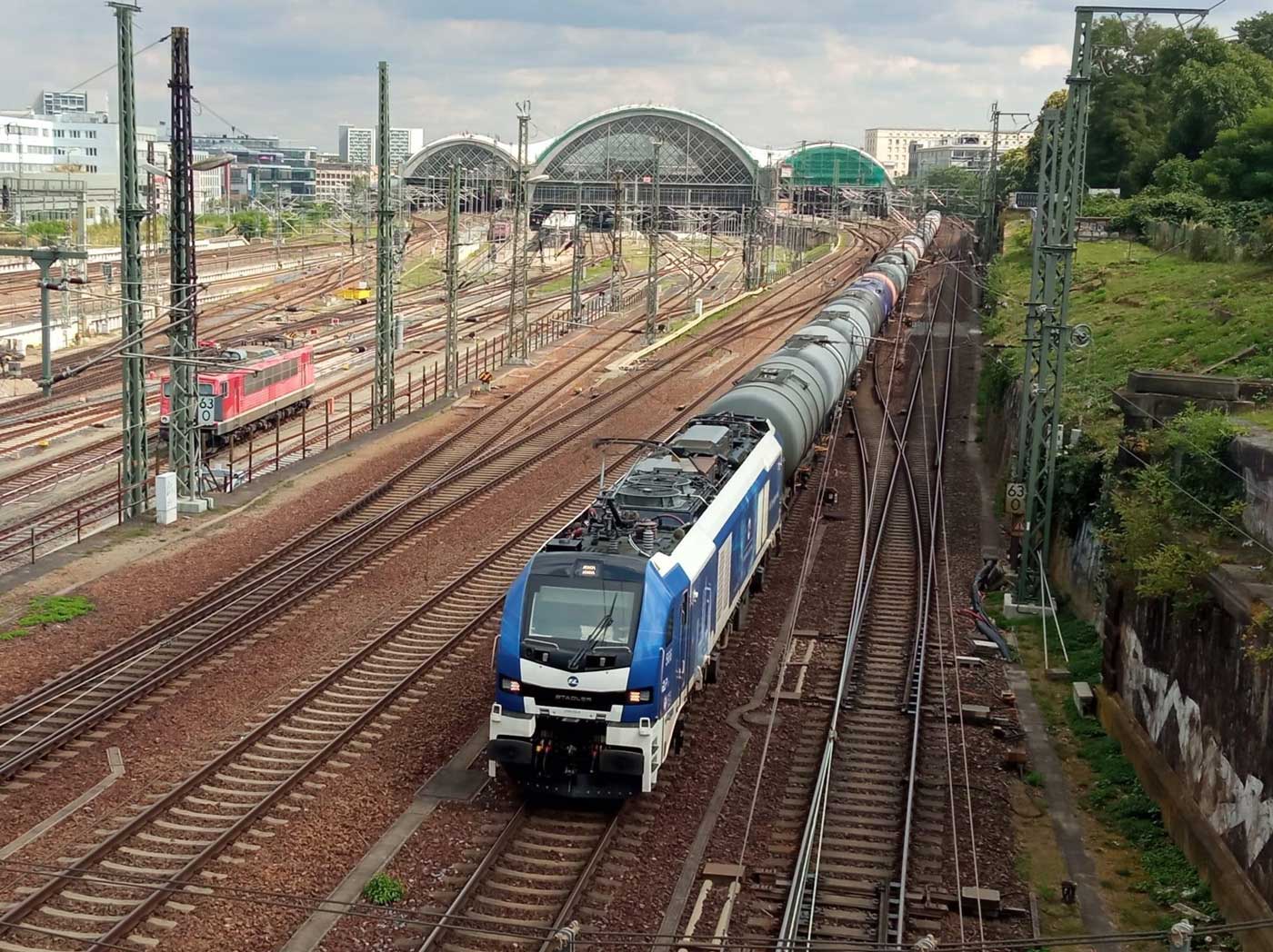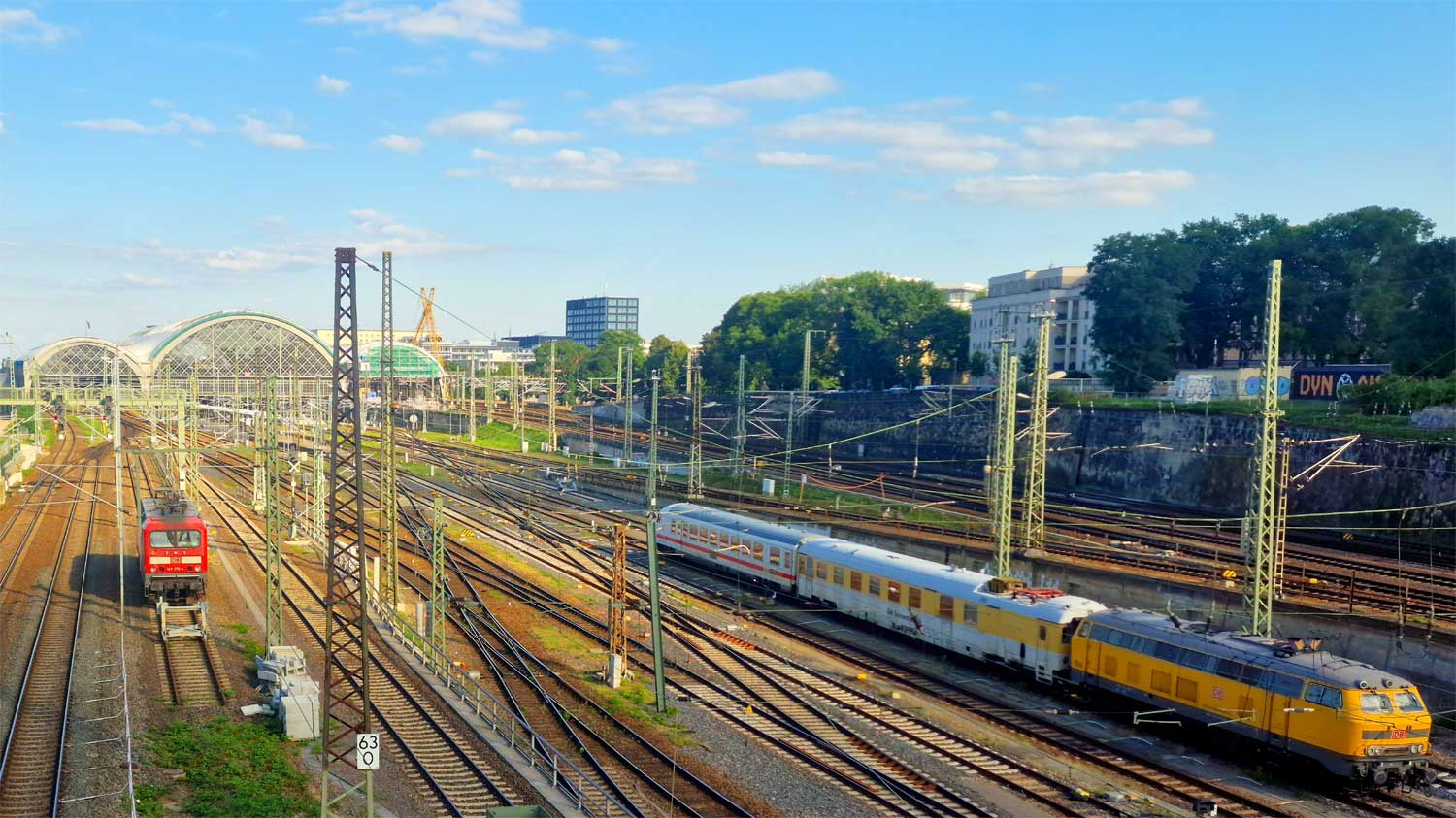 Im Hintergrund der S-Bahnhof Dresden Freiberger Straße an der Strecke