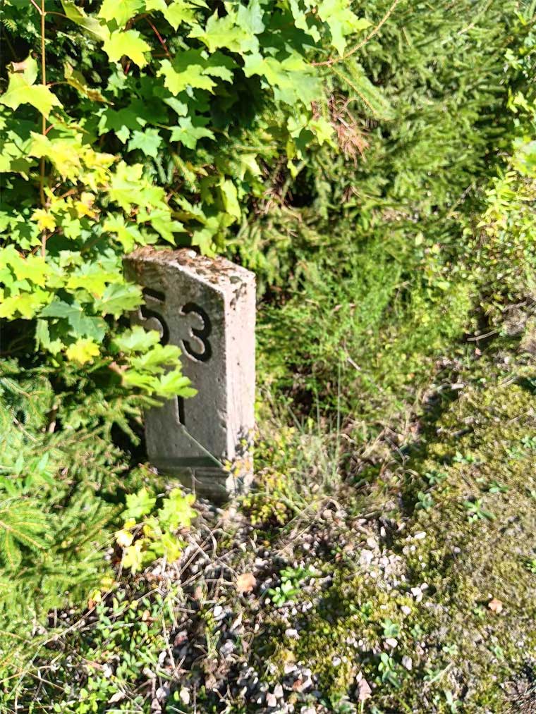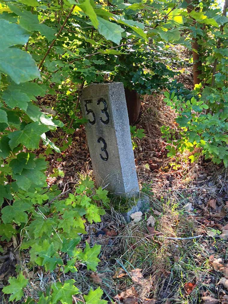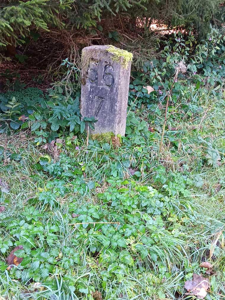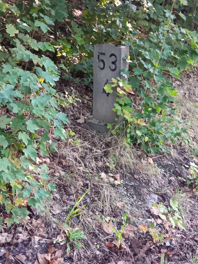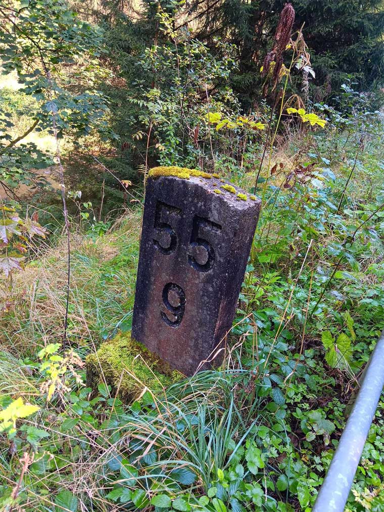 Davor der alte Myriameterstein 6 mit oben angebrachter Zahl 600 hm.