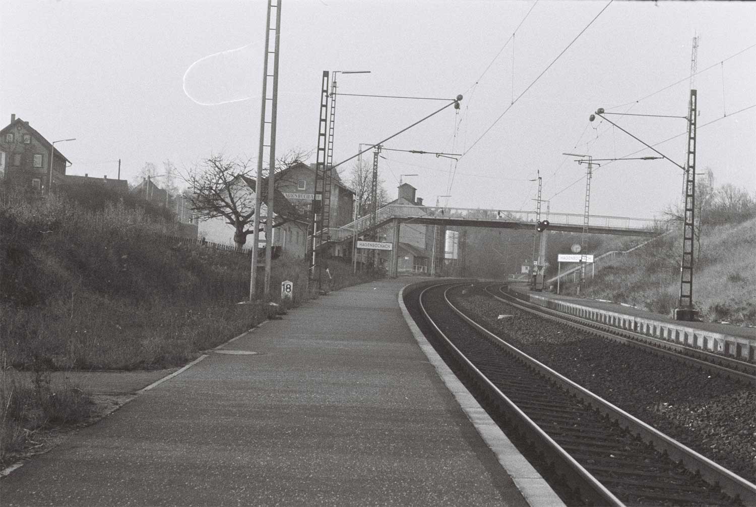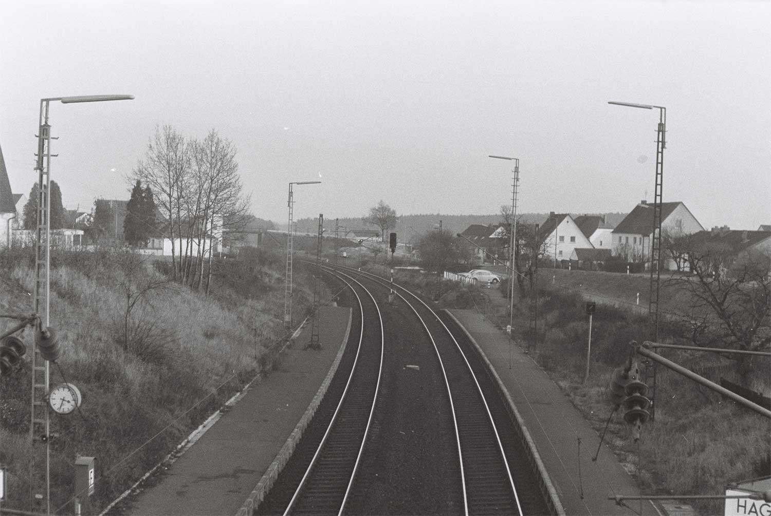 km 22,6 (Stein und Tafel) zwischen Hagenbüchach und Emskirchen an dem jetzt stillgelegten Streckenteil