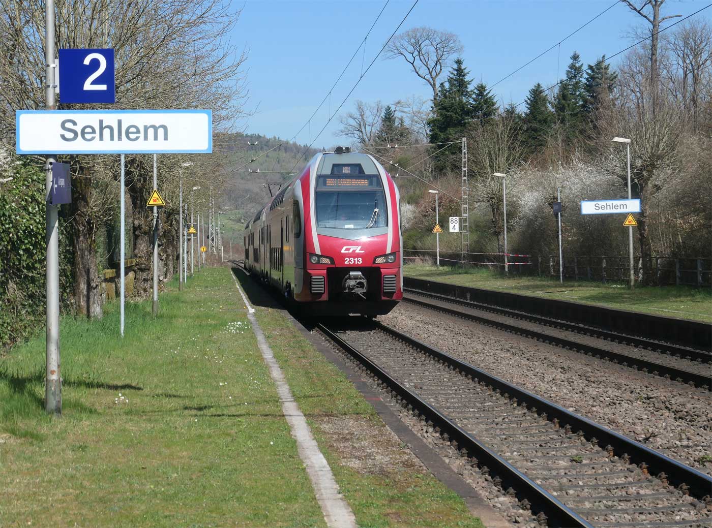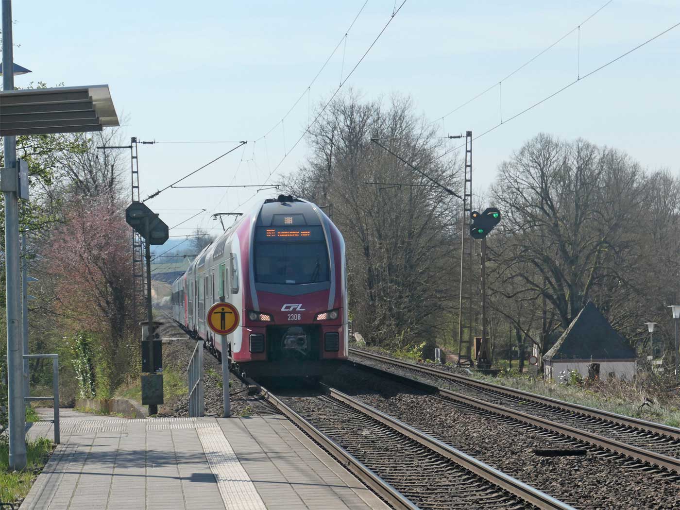 Diedenhofen 0,0 km 188,004 der Strecke Strassburg (Els) 0,0 - Mommenheim (Els) 22,271 - Zabern 43,989 - Rieding 66,821 - Berthelmingen 78,067 - Bensdorf 101,417 - Remilly 132,136 - Metz Hbf 154,343 - Woippy 160,247 = km 164,490 (entstand durch Umbau Metz Hbf vom Kopfbf zum Durchgangsbf 1908) - Diedenhofen 188,004 - Grenze Lothringen/Luxemburg 203,757 = [km 0,0 - Bettemburg 5,162 - Luxemburg 16,638 - Ettelbrück 47,184 - Ulflingen 85,562 - Grenze Luxemburg/Belgien 93,429 - Ri Lüttich]