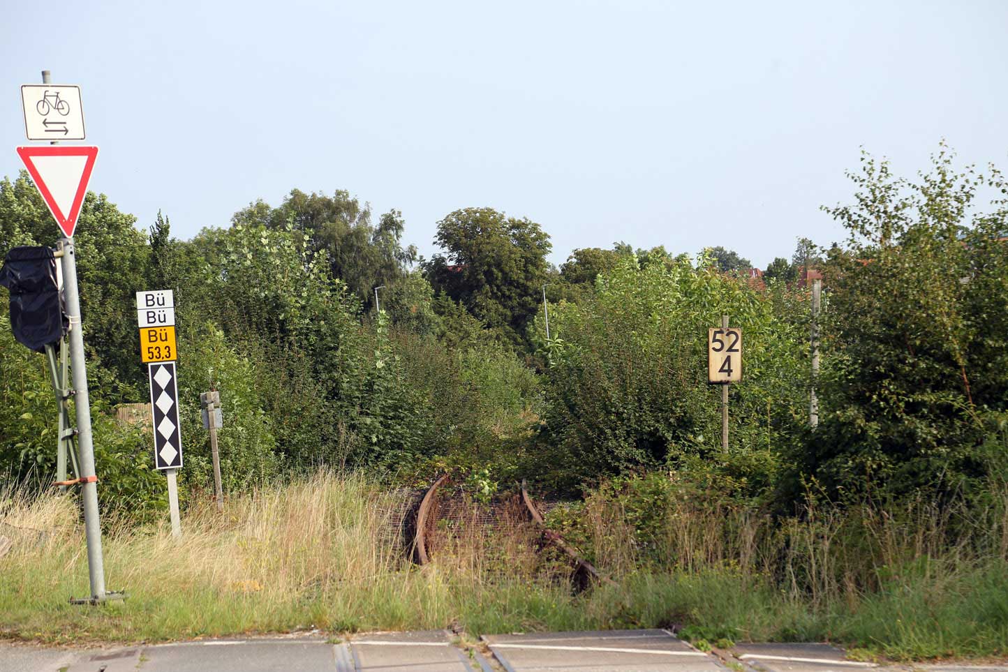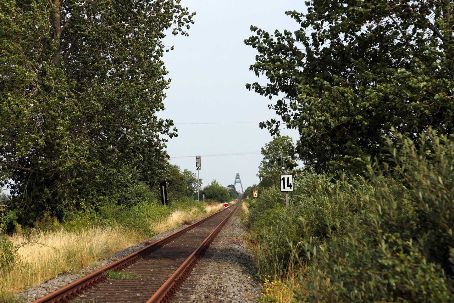 Links das Gleis führt zum Skandinavien-Kai, im Hintergrund die Brücke über die B 75.