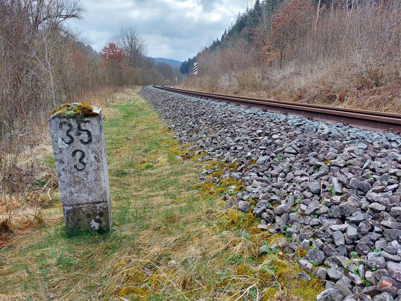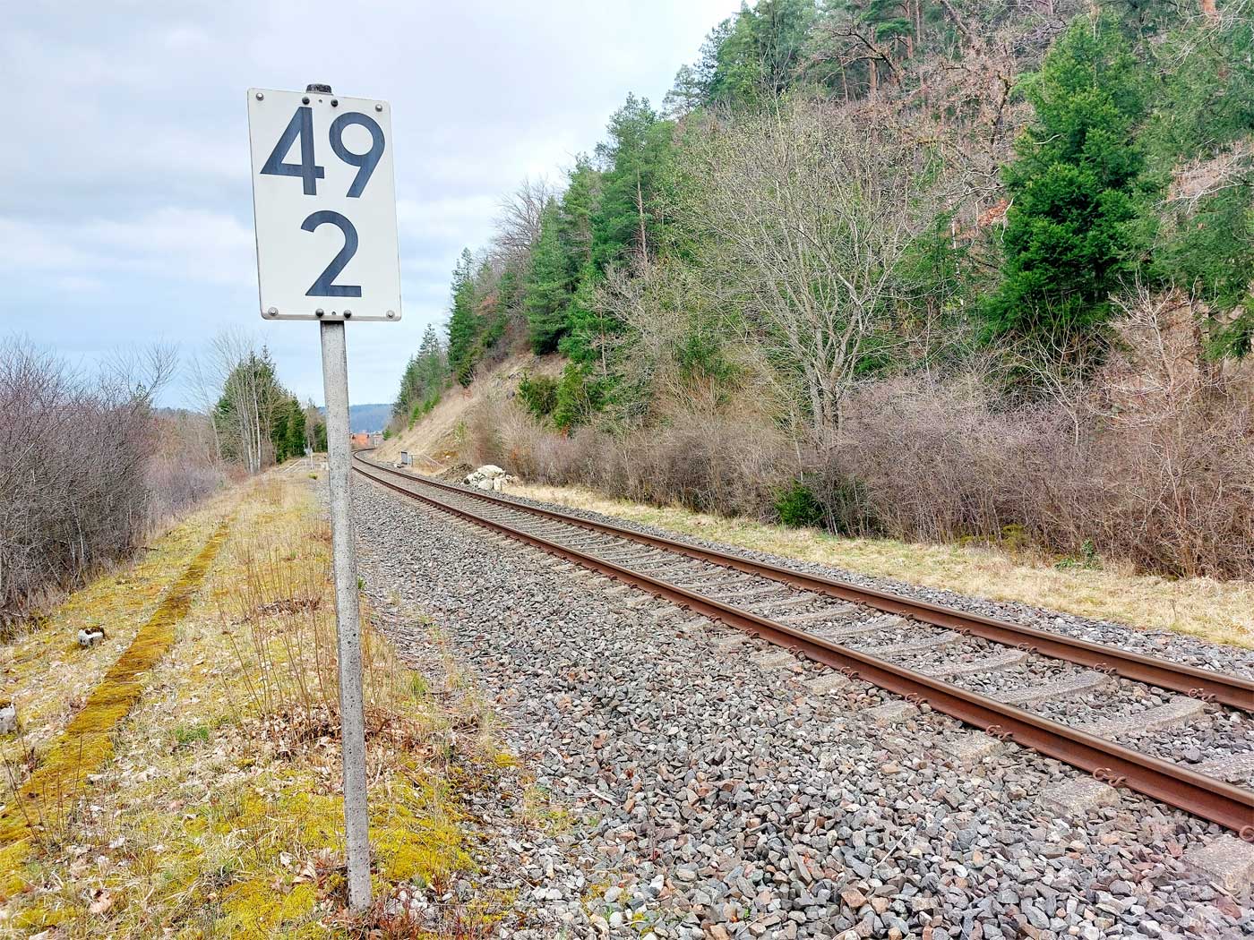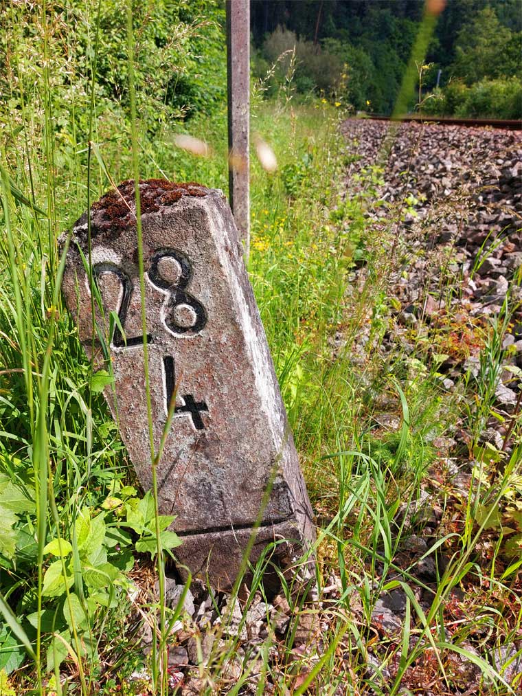 Im Hintergrund die Strecke Eutingen im Gäu - Freudenstadt Hbf - Schiltach mit der Kilometertafel 2,2