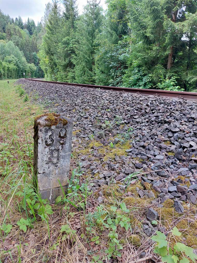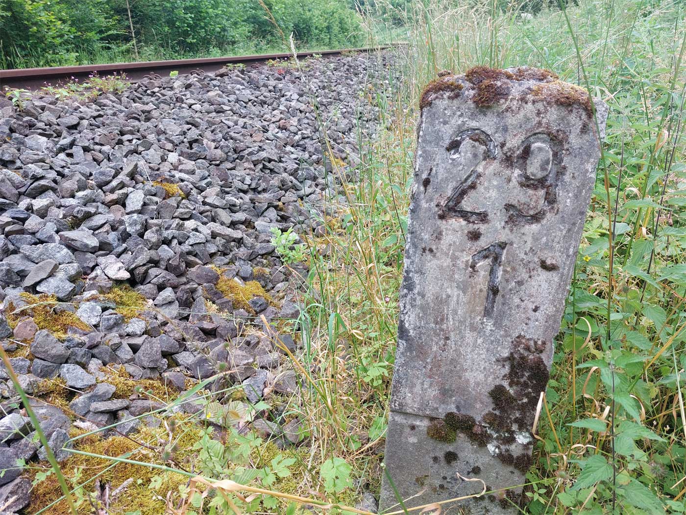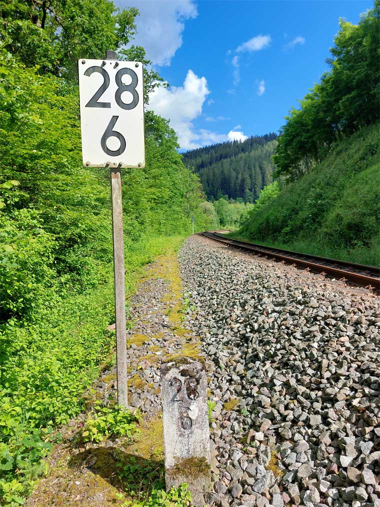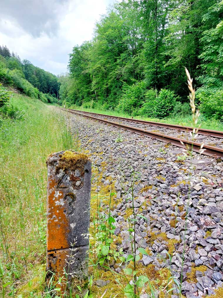 Im Hintergrund die Strecke Eutingen im Gäu - Freudenstadt Hbf - Schiltach mit der Kilometertafel 2,2