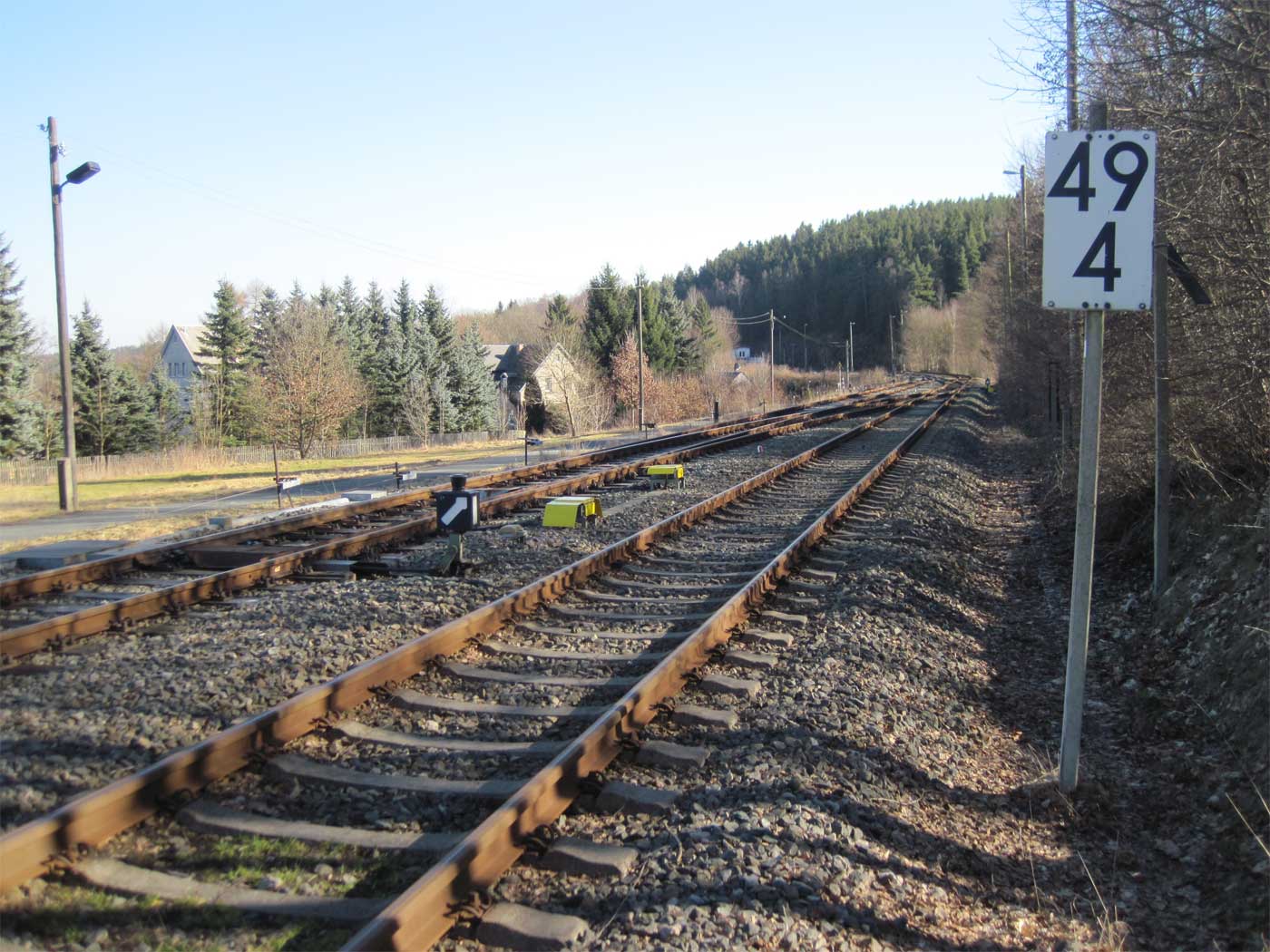 Oelsnitz (Vogtl) 19,831 km 47,29 der Strecke Herlasgrün 0,22 - Falkenstein (Vogtl) 22,27 - Streckenunterbrechung - [Oelsnitz (Vogtl) 47,293] (HOe)