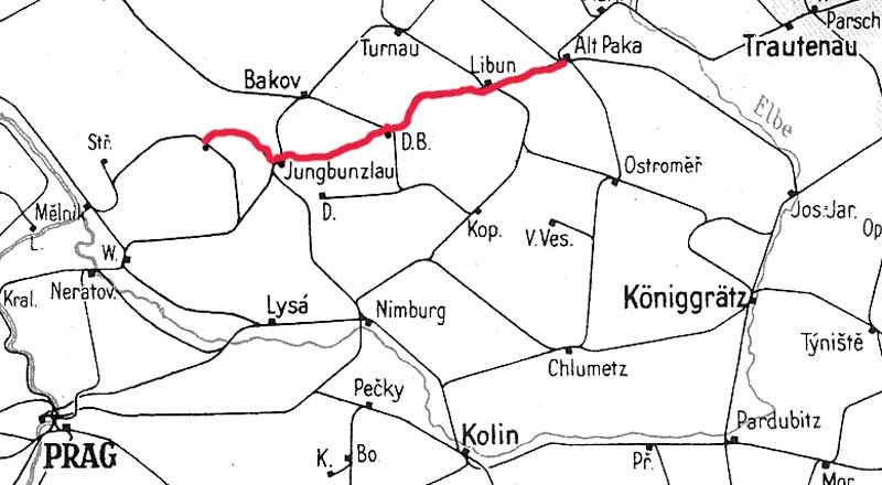 Skalsko / Skalsko 0,0 - Jungbunzlau Lokalbahnhof / Mladá Boleslav místní dráha 17,465 - Nieder Bausow / Dolní Bousov 34,385 - Libun / Libuň 53,452 - Altpaka / Stará Paka 73,779