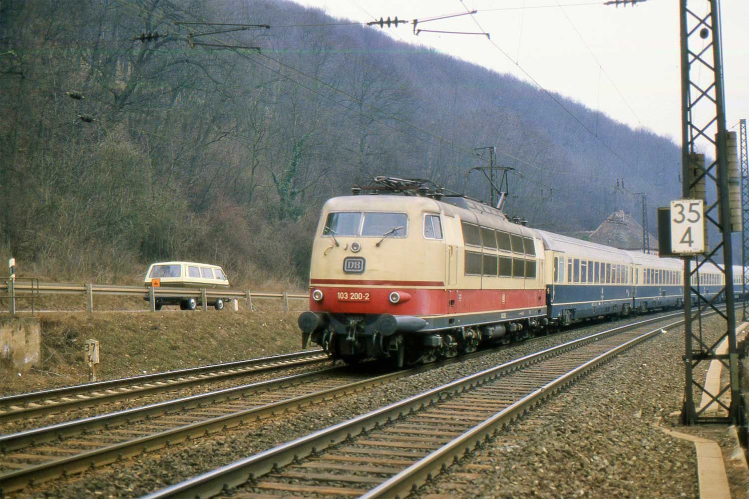 Der Zug mit der 103 194 befindet sich auf der Strecke Flieden 0,0 - Gemünden (Main) 56,338