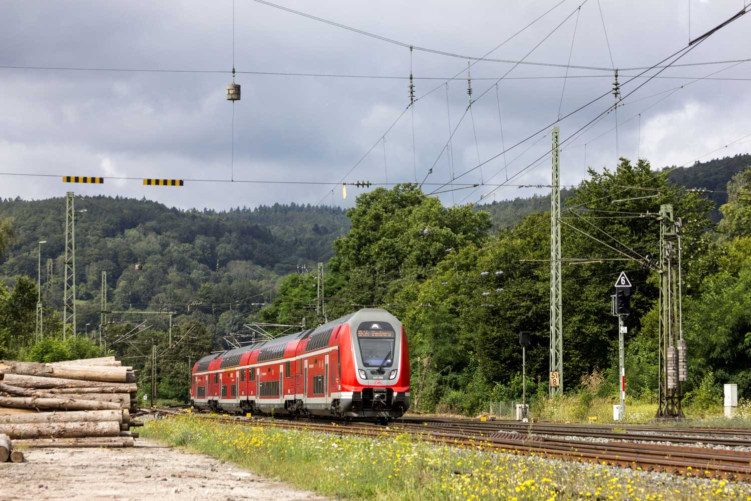 Der Zug befindet sich auf der Strecke Flieden 0,0 - Gemünden (Main) 56,338