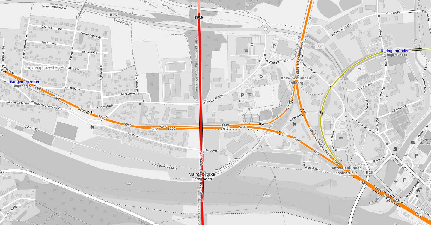 Links die Strecke Würzburg Hbf - Aschaffenburg Hbf (5200) mit km 40,2