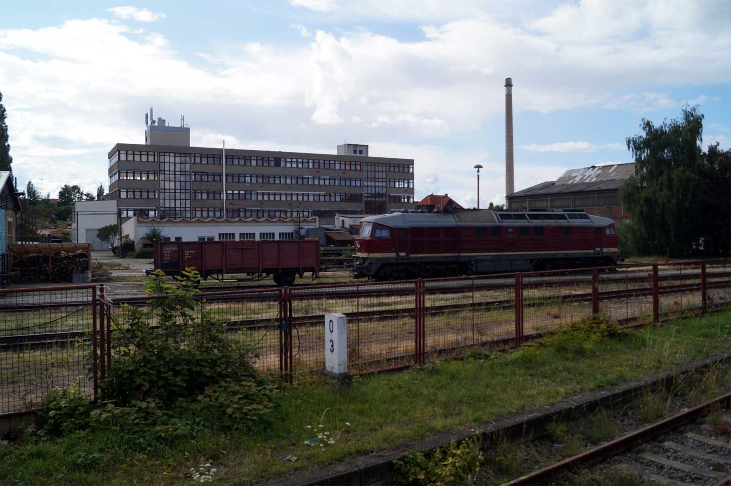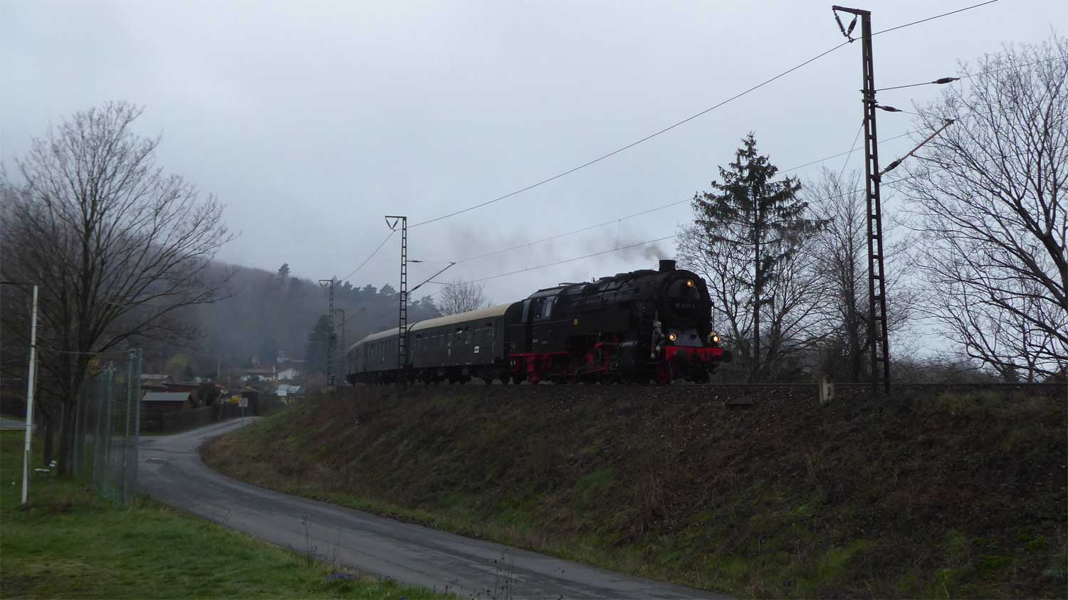 Der Zug befindet sich auf dem Anschlussgleis zu den Kalkwerken, rechts das Streckengleis