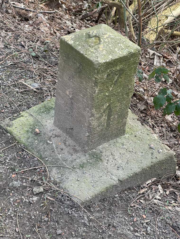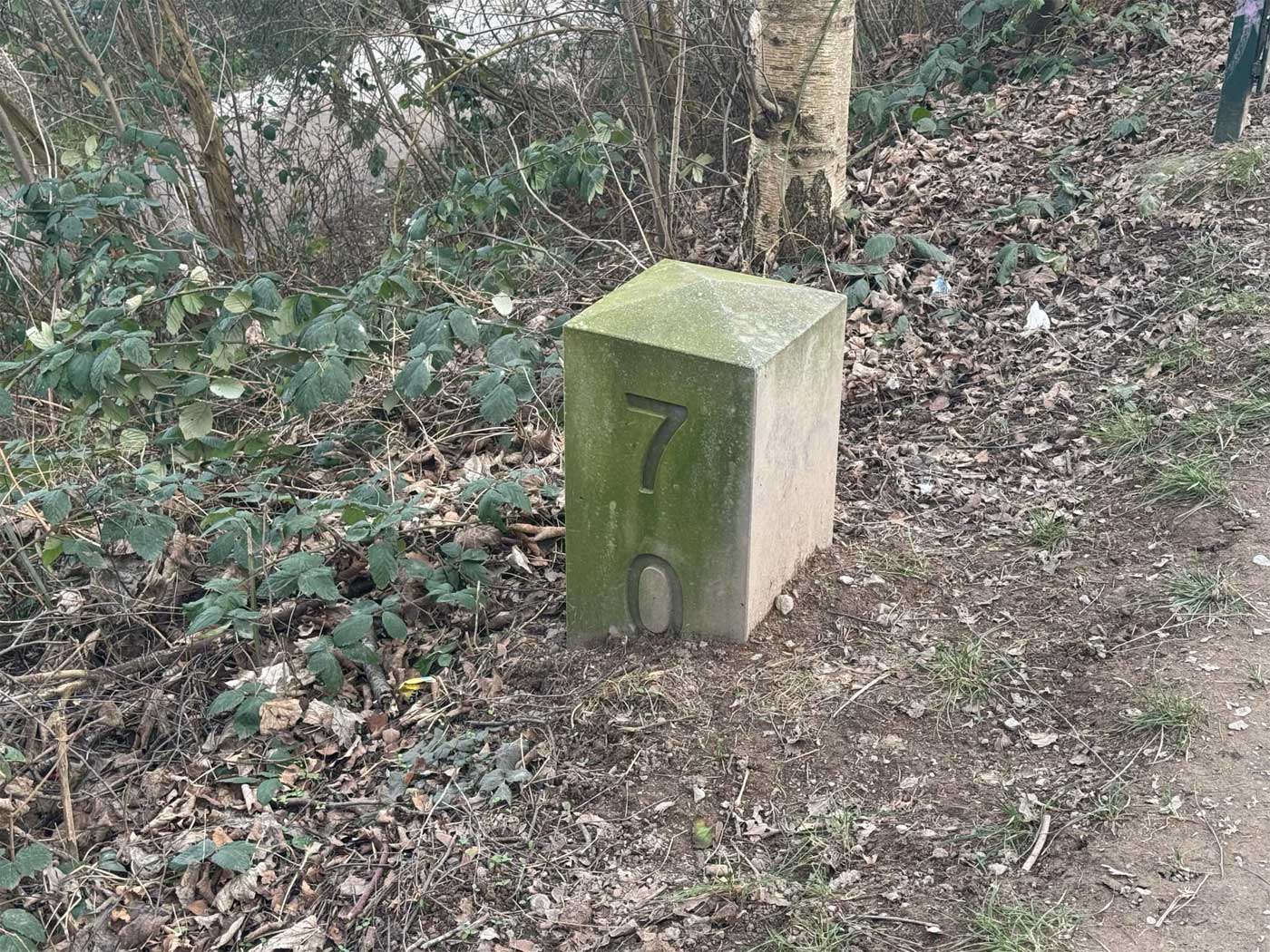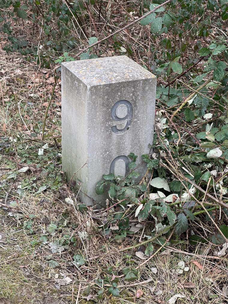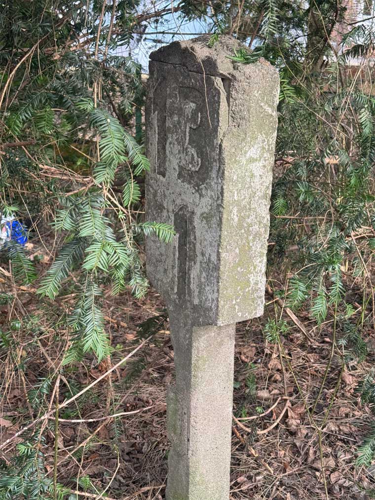 | km 21,43 der Strecke Essen-Überruhr 0,0 - Essen-Steele 2,27 - Bochum-Dahlhausen 7,00 - Streckenunterbrechung - Bochum-Weitmar 12,27 - Bochum-Langendreer 21,43 | ||
