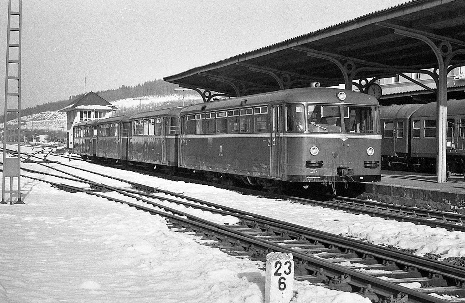 Olpe 23,57 km 73,56 der Strecke Siegburg 0,0 - Lohmar 6,93 - Streckenunterbrechung - Overath 20,45 - Dieringhausen 45,10 - Olpe 73,56