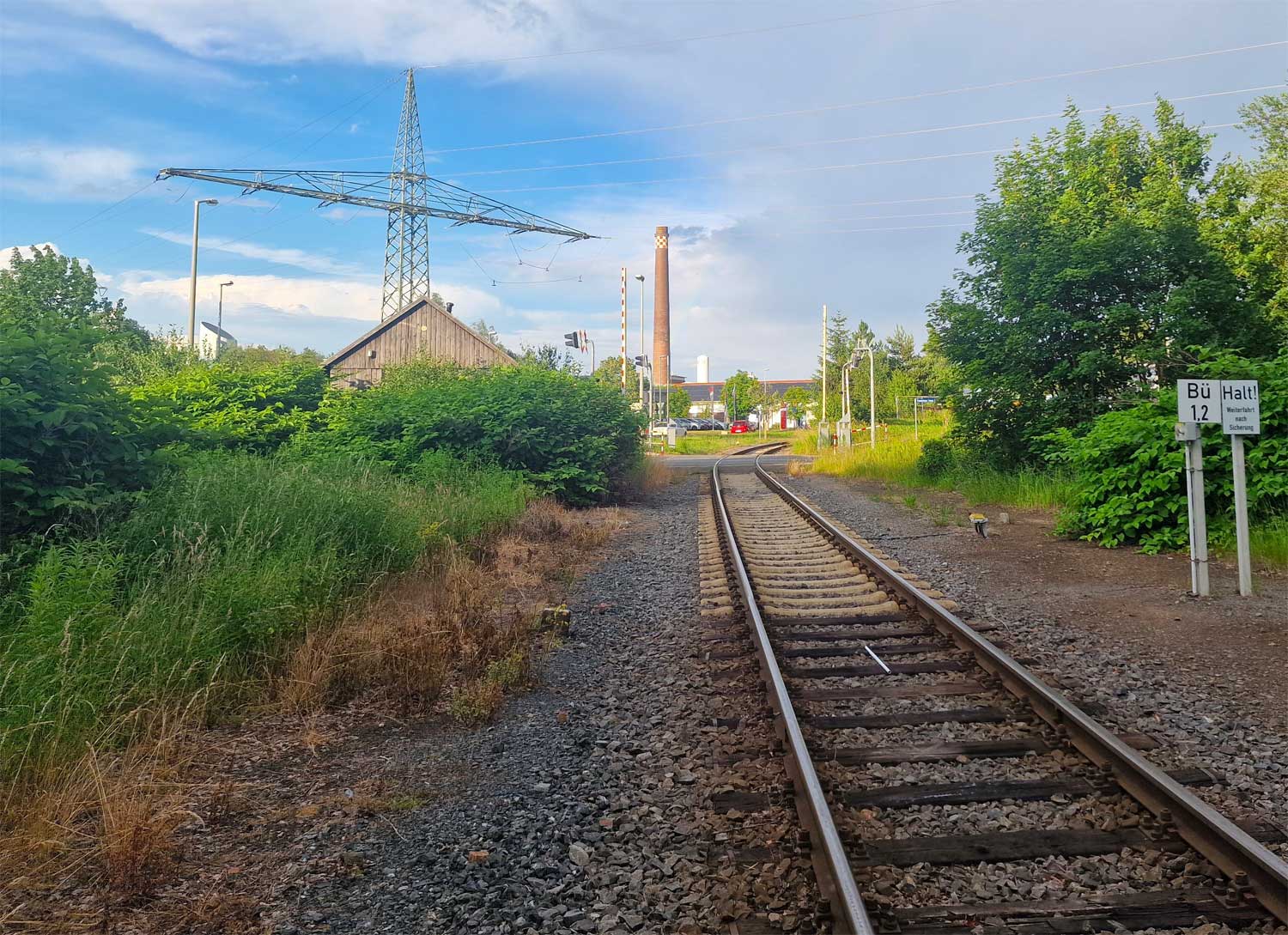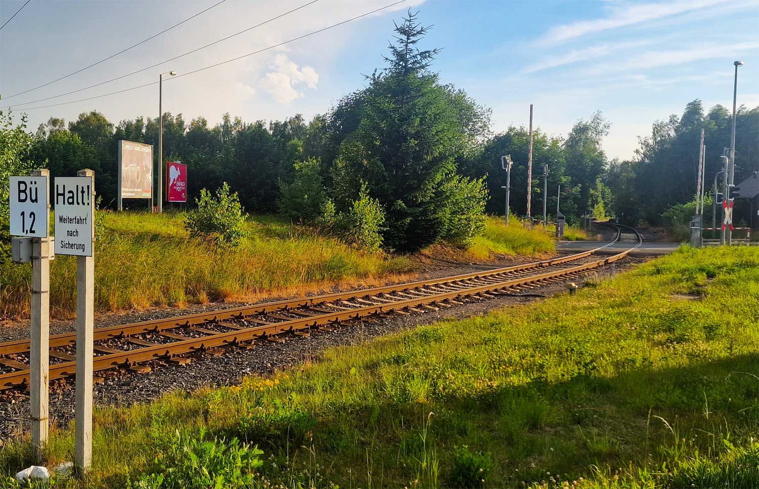 BÜ km 1,2 im Anschlußgleis Industriegebiet Saxonia Foto: Dietmar Levie, 18.06.2024 Auszug Streckenkarte