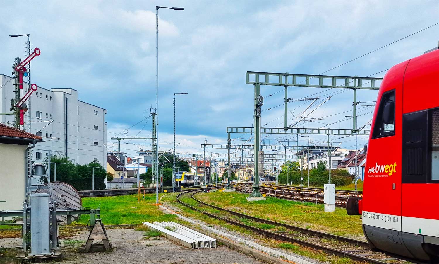 Im Hintergrund links St. Canisius und rechts das Stellwerk FrHafen 4 für den Fährenbetrieb nach der Schweiz.