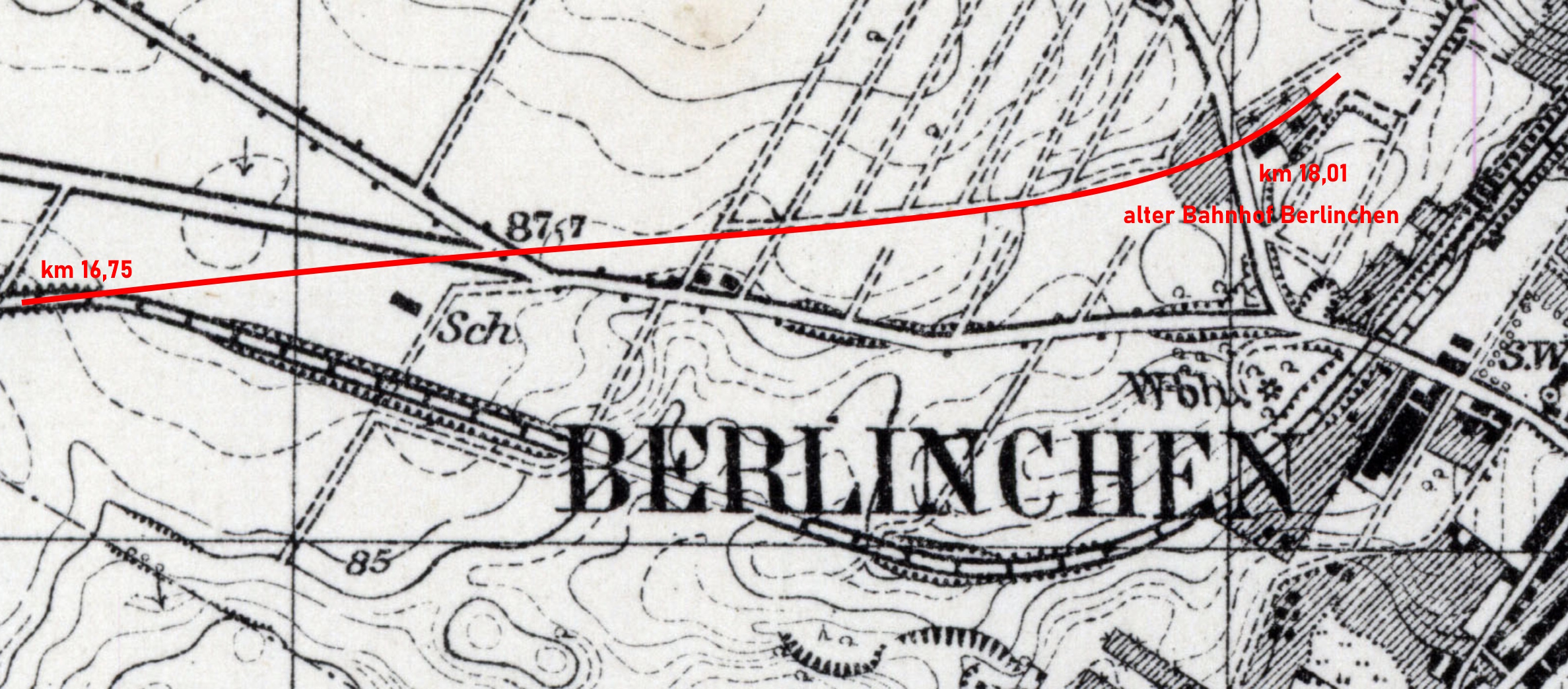Beim Weiterbau der Strecke von Berlinchen nach Arnswalde wurde ab km 16,75 eine neue Linienführung gewählt und am km 19,35 ein neuer Bahnhof in Berlinchen angelegt.