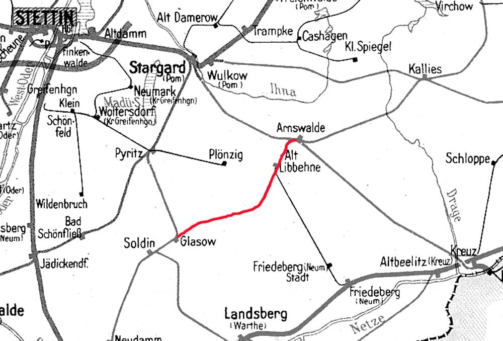 Die Strecke Glasow - Berlinchen wurde am 31.01.1883 durch die Glasow - Berlinchener Eisenbahn mit einer Länge von 18,01 km eröffnet.
