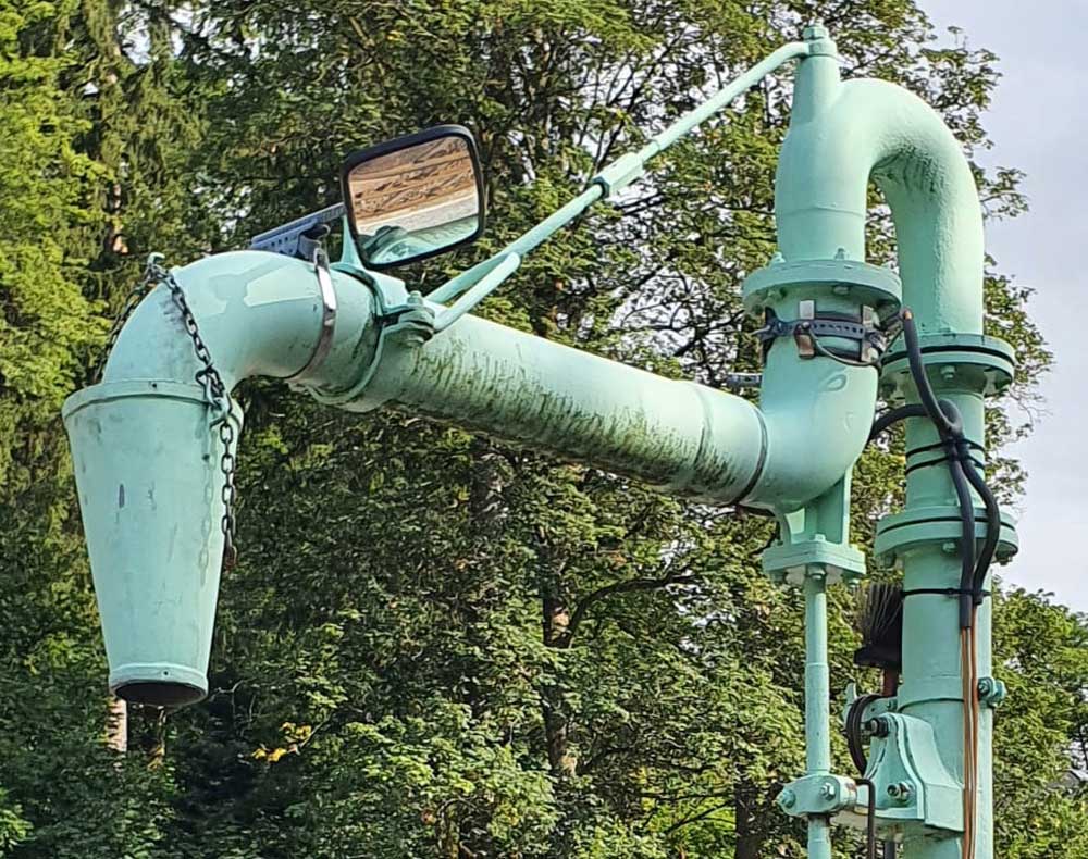 Der Spiegel dient wahrscheinlich zur Beobachtung des Wasserstandes beim Befüllen.