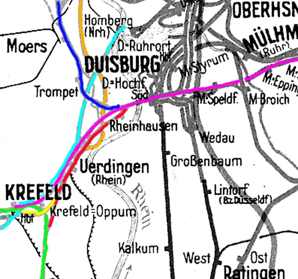 violett: Krefeld-Oppum - Duisburg-Hochfeld Süd - Mülheim-Eppinghofen - Essen Nord - Bochum-Langendreer - Dortmund Süd