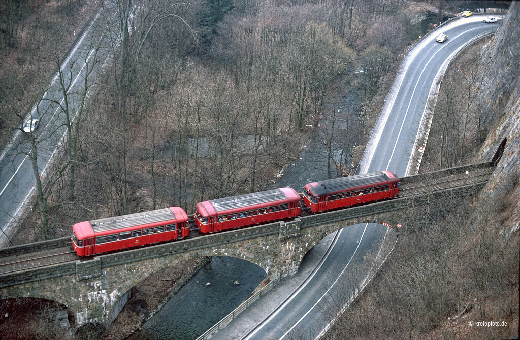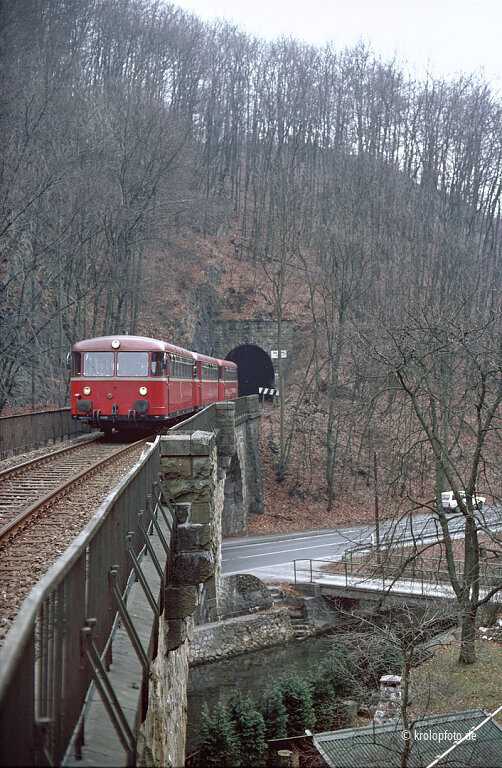 Die Garnitur 998 704/998 087/798 515 hat den Uhu-Tunnel durchquert und läuft nun als N 6459 (Fröndenberg- Neuenrade) in den Haltepunkt Klusenstein ein.