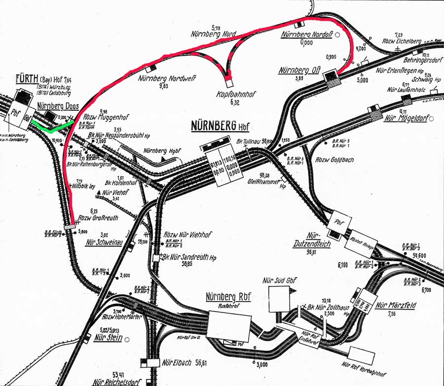 Nürnberg Ost 0,0 - Nürnberg Nordost 3,85 - Nürnberg Nord 5,79 - Nürnberg Nordwest 8,63 - Abzw Muggenhof 9,98 - Abzw Großreuth 12,2
