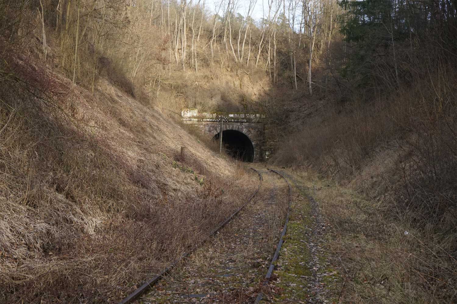 Hier gibt es eine vermutlich weltweit einmalige Tunneltrennwand aus Betonfertigteilen. Der Tunnel war um 1870 zweigleisig gebaut, das zweite Gleis aber nie verlegt worden.