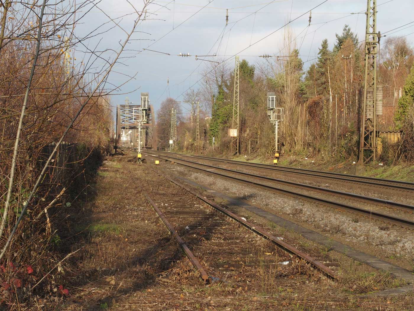 Im Vordergrund Gleisrest der Strecke Bk Hohenrhein 0,09 - Oberlahnstein 2,56 etwa bei km 2,2