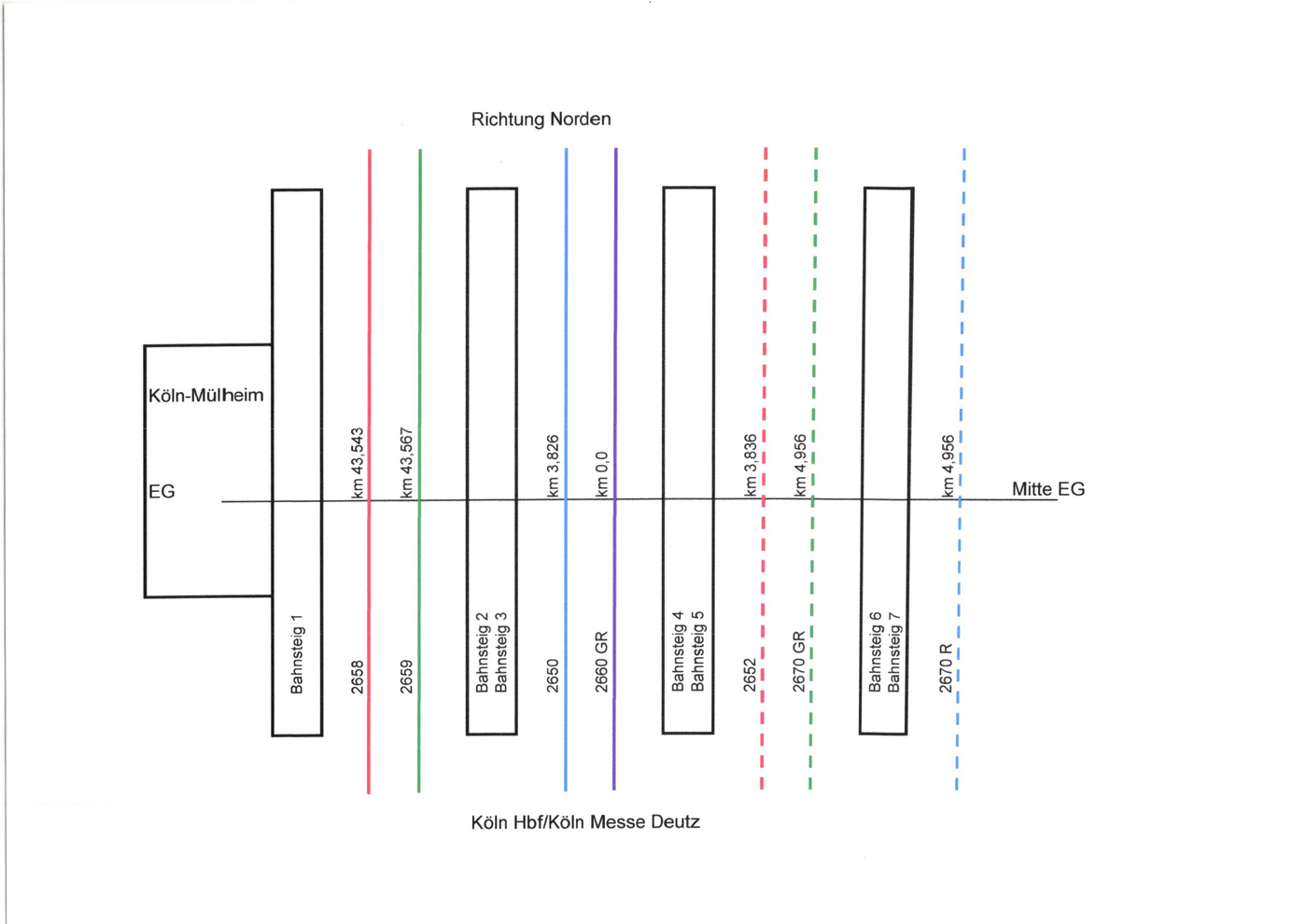 | Köln-Deutz | 0,0 | km 0,0 der Strecke Köln-Deutz 0,0 - Düsseldorf Hbf 38,22 (kommend)/39,48 (gehend) - Duisburg Hbf 63,10 - Oberhausen Hbf 70,71 - Wanne-Eickel Hbf 94,54 - Dortmund Hbf 119,51 - Hamm Pbf 150,73 |