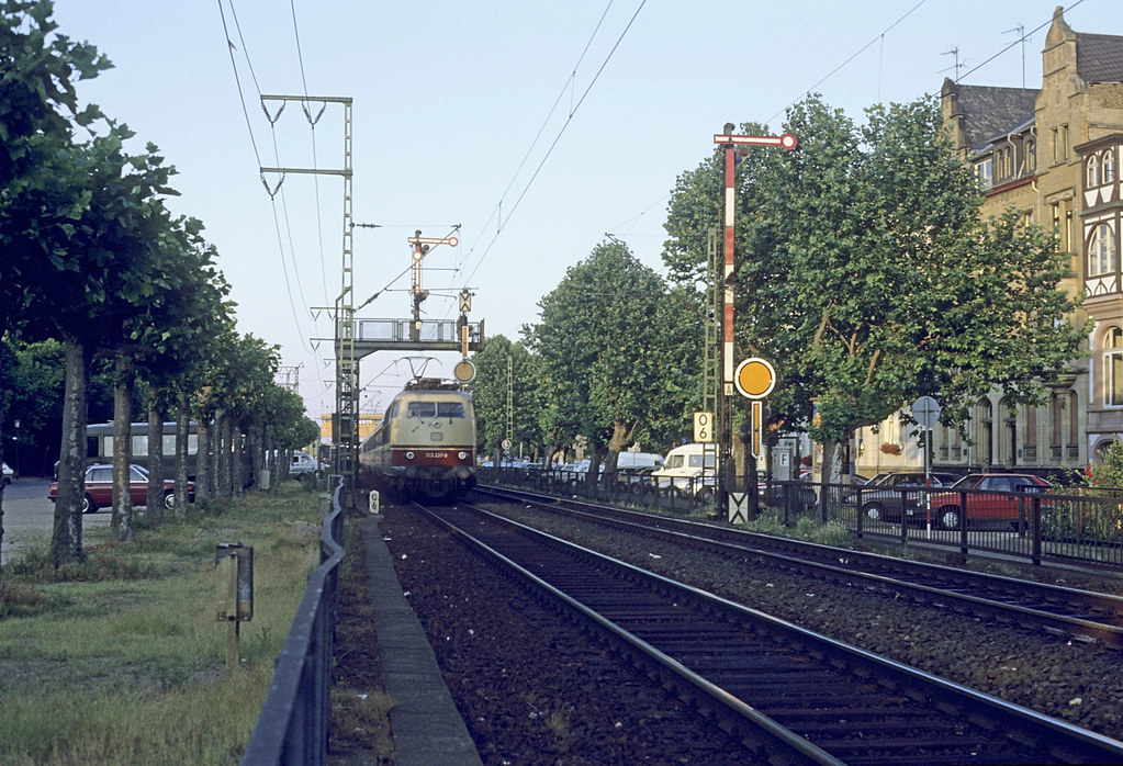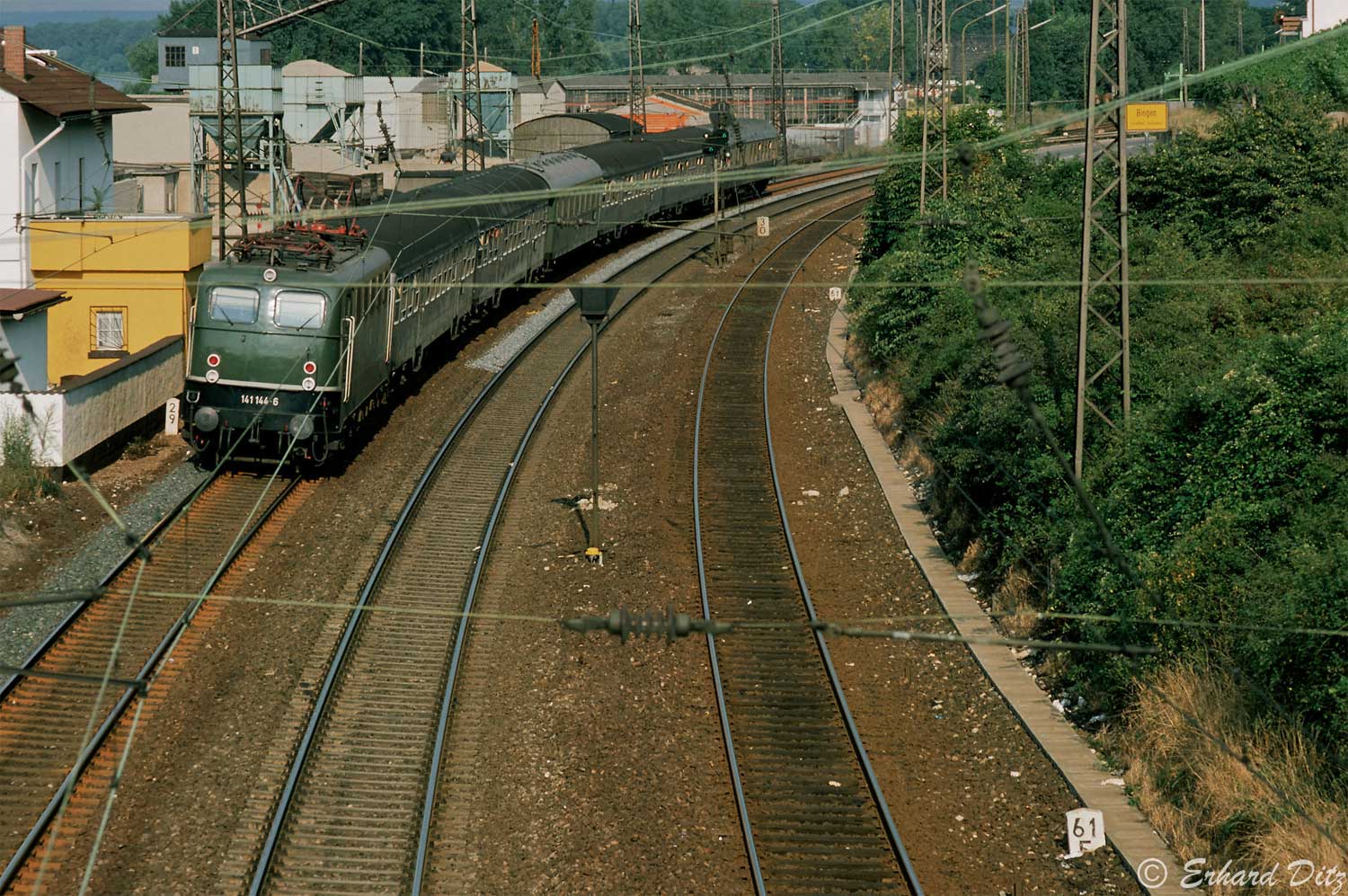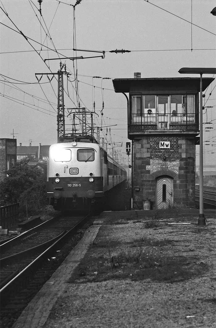 km 0,4 in Bingen (Rhein) - 110 159 (Bw Köln) mit dem D 704 - Im Hintergrund das noch grüne Reiterstellwerk