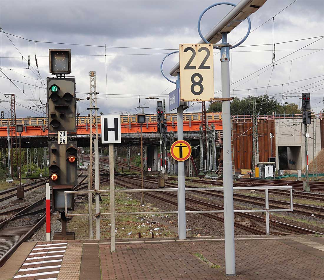 km 0,0 der Strecke Frankfurt (Main) Hbf 0,0 - Frankfurt (M)-Louisa 3,73 - Darmstadt Hbf 27,73 (Gegengleis 27,76) - Mannheim- Friedrichsfeld 77,06 - Schwetzingen 84,56