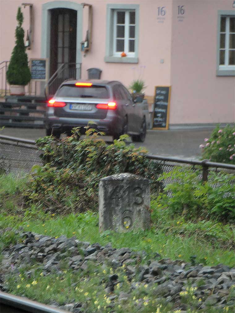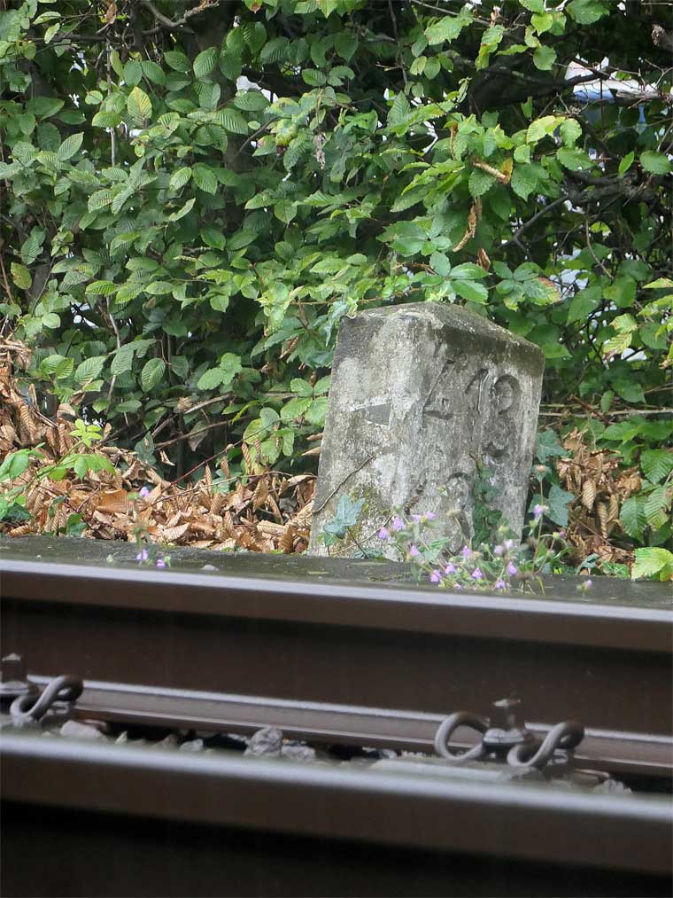 km 413,8 (Tafel) und km 414,0 (Stein) in Konstanz - Blick Richtung Mannheim