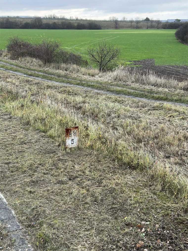 Rechts im Hintergrund (ansteigend) km 0,8; km 1,0 und km 1,2 der Strecke