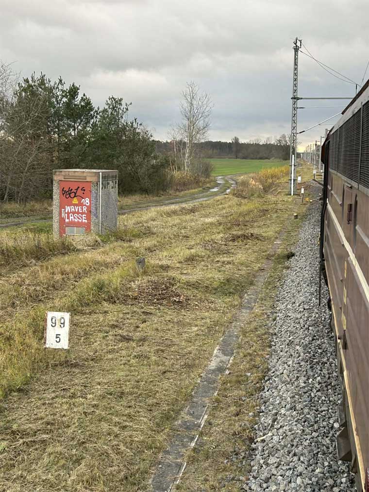 | ► | km 62,82 der abgehenden Strecke (Berlin Anhalter Bf -0,07) - Jüterbog 62,82 - Falkenberg (Elster) (unten) 112,25 - Röderau 140,87 - Abzw Zeithain Bogendreieck 142,06 (mit Zweigstrecke von Röderau 140,87 nach Abzw Röderau Bogendreieck 141,96) mit weiterlaufender Kilometrierung (Streckenverzweigung mit gemeinsamen Nullpunkt Berlin Anhalter Bf) | |