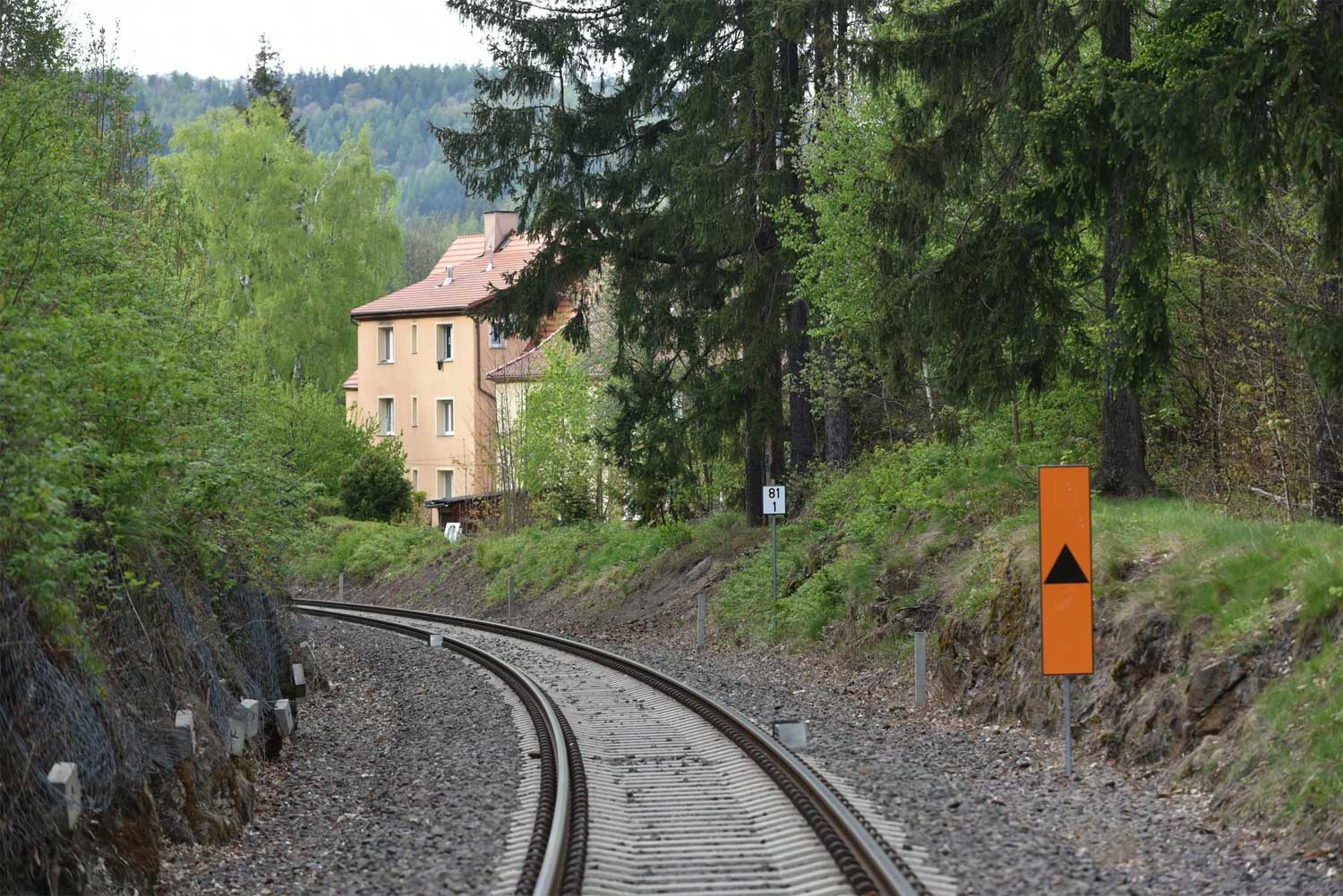 km 79,7 (Stein und Tafel) zwischen Jedlina-Zdrój Centrum und Jedlina Zdrój (Bad Charlottenbrunn) - Blick Richtung Jedlina Zdrój (Bad Charlottenbrunn)