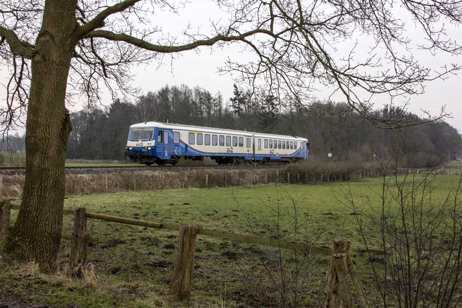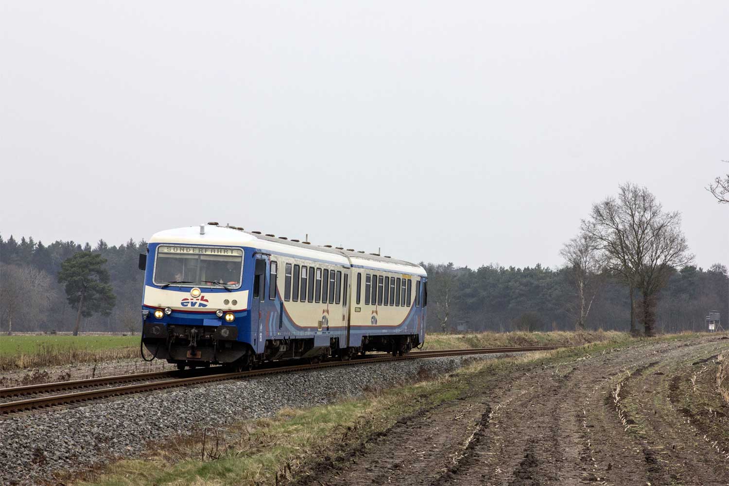 628 555 hat nach erfolgter Zugkreuzung mit 628 542, welcher noch im Hintergrund zu erkennen ist, gerade Dorfmark als RB14727 verlassen.