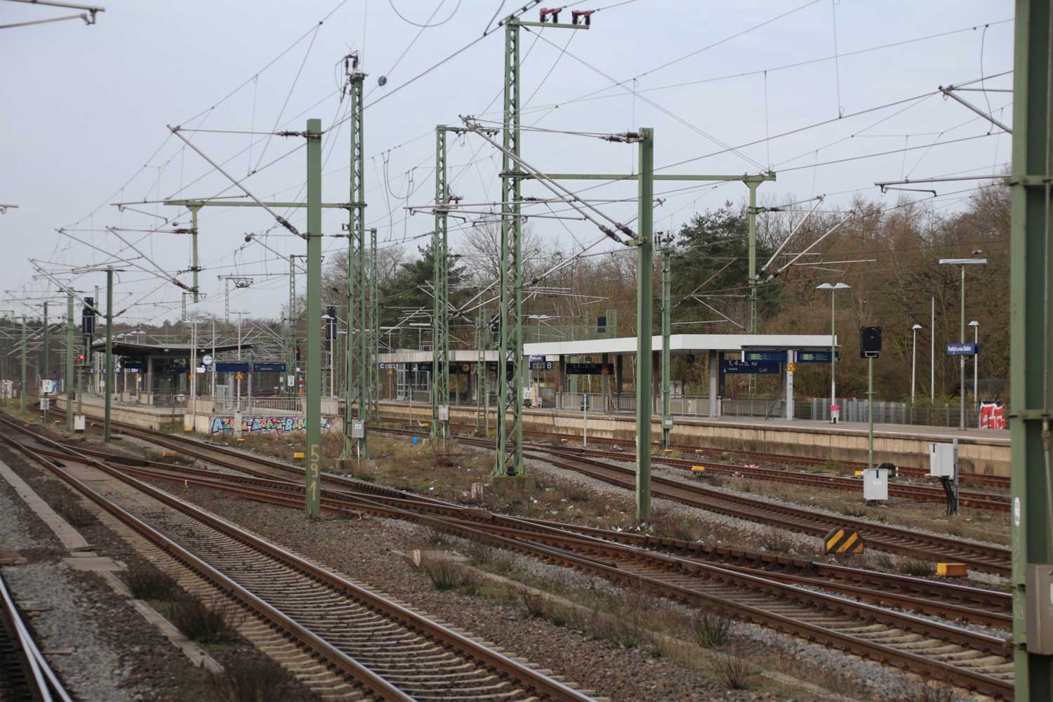 | ► | km 7,78 der abgehenden Strecke (Mainz Hbf 0,0) - Darmstadt Hbf 33,38 (kommend von Mainz Hbf)/34,54 (kommend von Mainz Hbf Gegengleis)/33,96 (gehend nach Aschaffenburg) - Aschaffenburg Hbf 77,718 mit Zweigstrecke von Abzw. Stockschneise 29,68 nach östlich Darmstadt-Kranichstein 35,78 (=41,30 der Hauptstrecke) mit weiterlaufender Kilometrierung (Streckenverzweigung mit gemeinsamen Nullpunkt Mainz Hbf) | |
