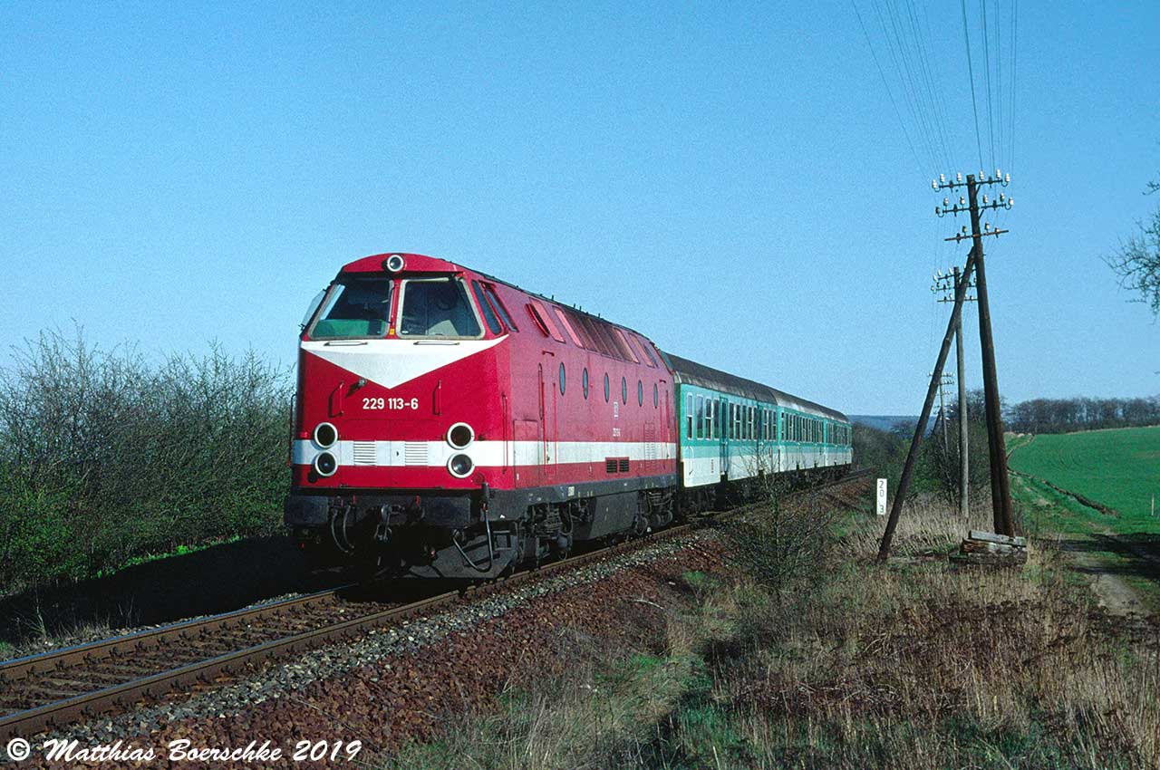 Leinefelde   67,10 km 139,35 der Strecke Halle (Saale) Hbf 0,0 - Blankenheim Trennungsbf 46,59 - Sangerhausen 59,22 - Nordhausen 97,07 - Wolkramshausen 105,29 - Bleicherode Ost 115,41 - Leinefelde 139,35 - Heiligenstadt 155,14 - Arenshausen 166,99 - Grenze Sowjetische Besatzungszone/Britische Besatzungszone 169,15 - Eichenberg 170,48 - Hann Münden 193,54