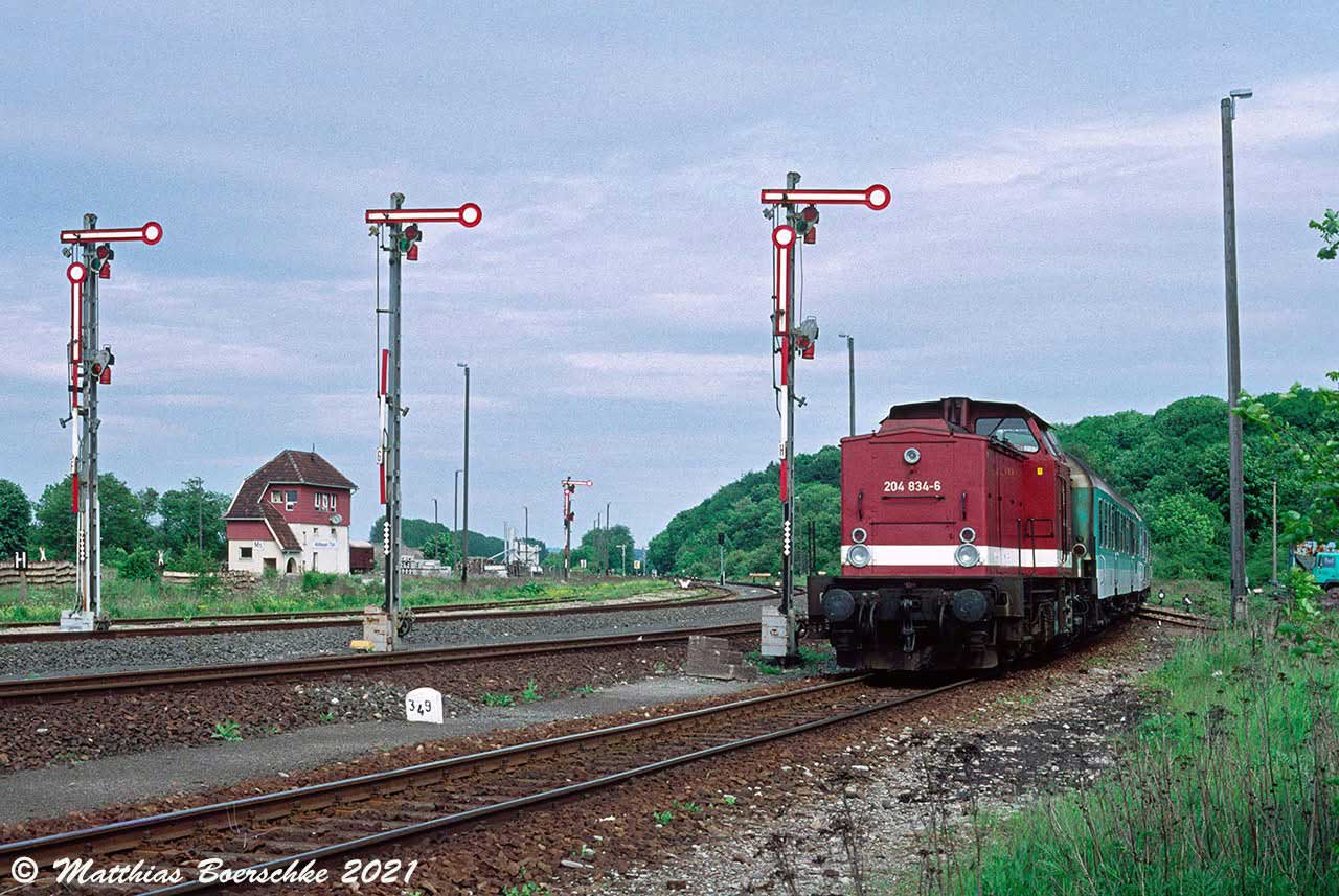 Birkungen   63,69 km 3,41 der Strecke Leinefelde 0,0 - Abzw Silberhausen Stw Sn 8,22 - Geismar 34,66 - Streckenunterbrechung - Grenze DDR/BRD 37,86 - Streckenunterbrechung - Schwebda 41,27 - Eschwege West 49,20 -Waldkappel 62,26 - Streckenunterbrechung - Spangenberg 79,98 - Malsfeld 89,61 - Treysa 129,99
