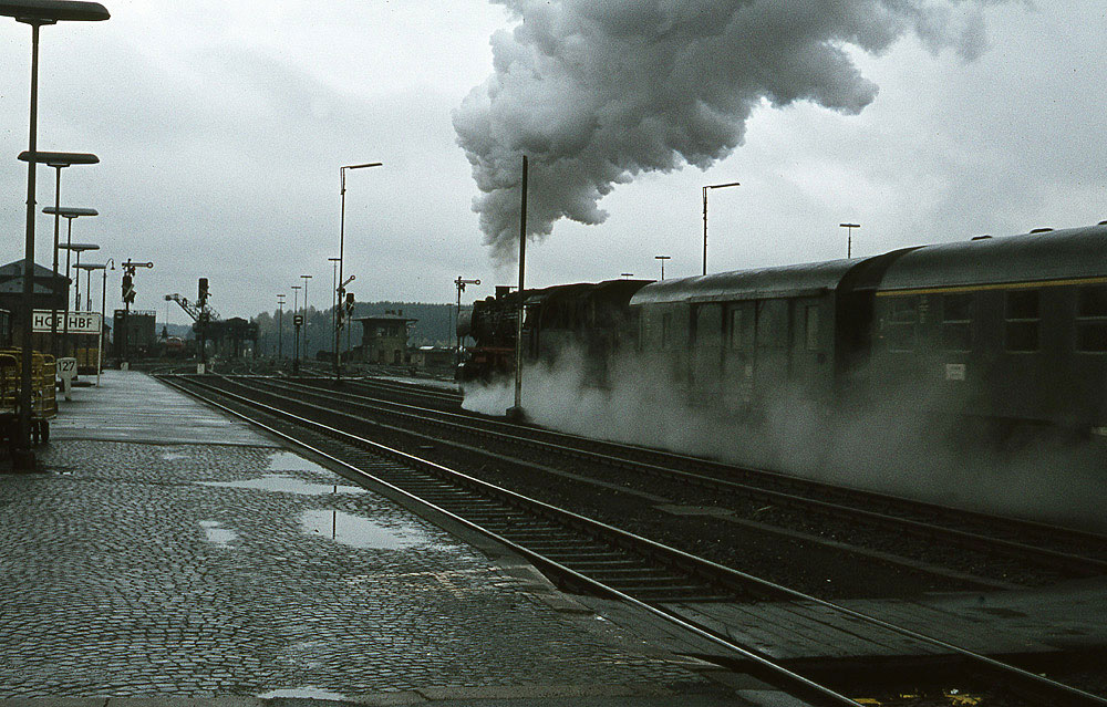 Drei Dampfloks hatten in Hof Hbf ihre Personenzüge am Haken: 050 281 fuhr mit dem N 3285 (Hof 17.10 Uhr – Schwandorf 19.51 Uhr) gerade aus,
