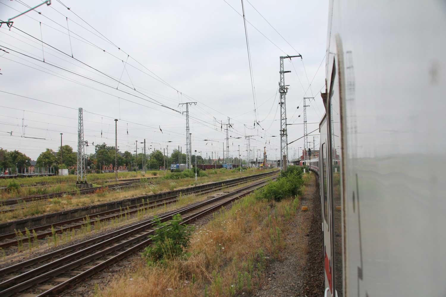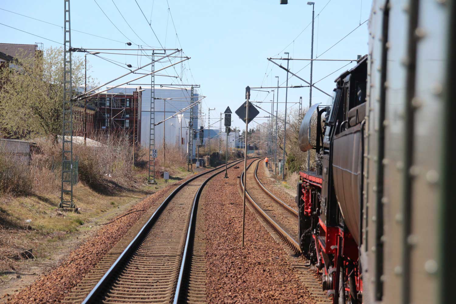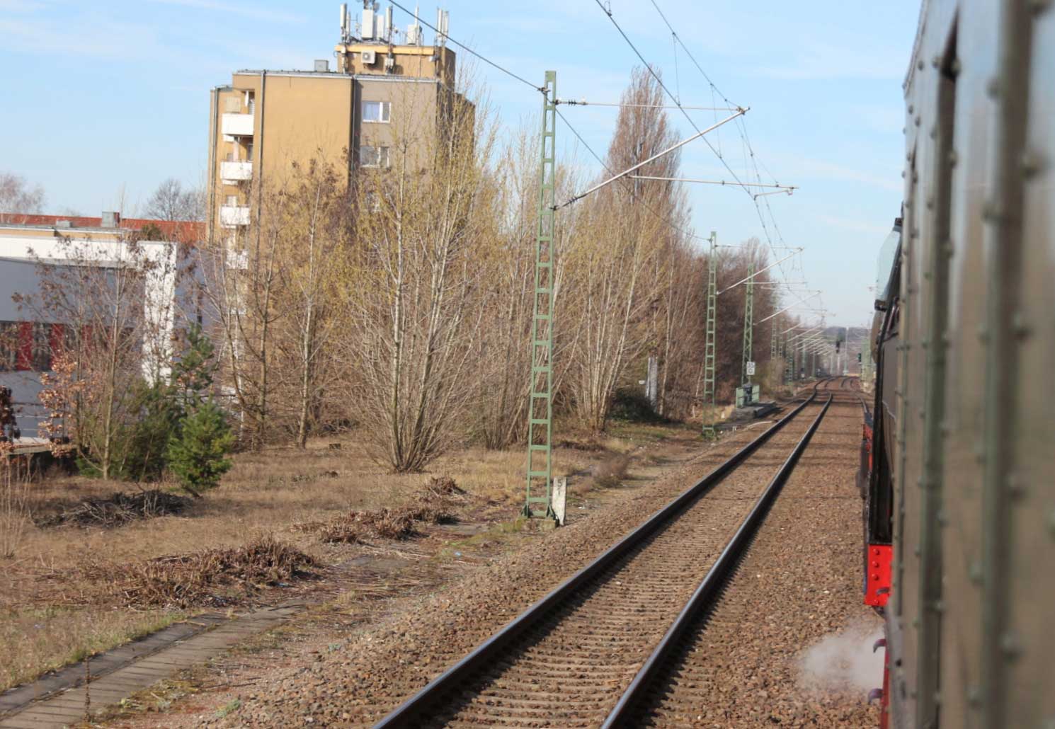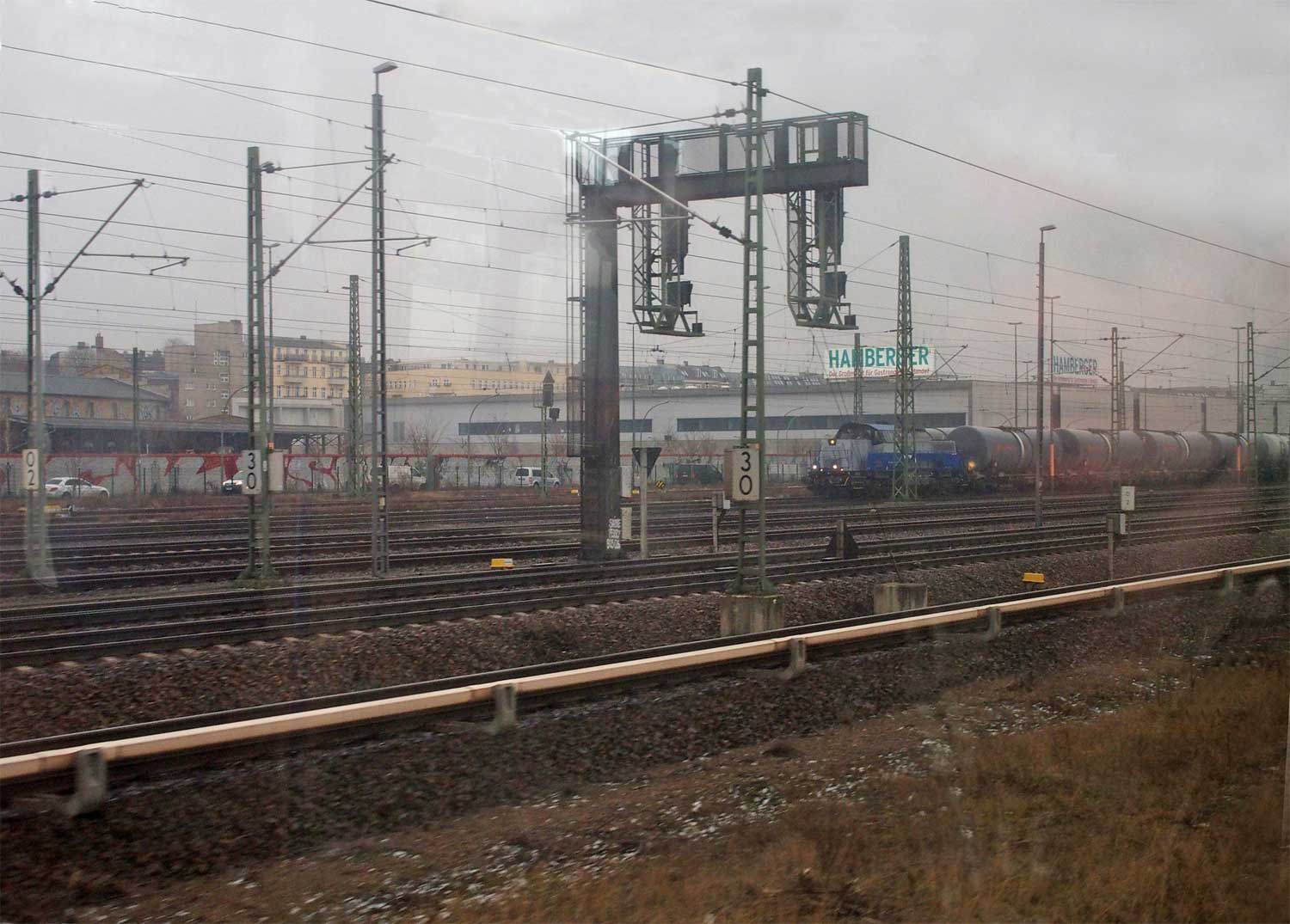 Der Zug befindet sich auf der Strecke nach Hildesheim und quert gerade das Gleis von Berlin Lehrter Bf.
