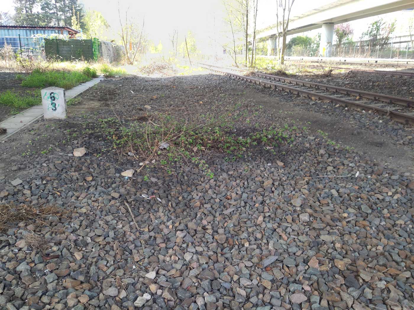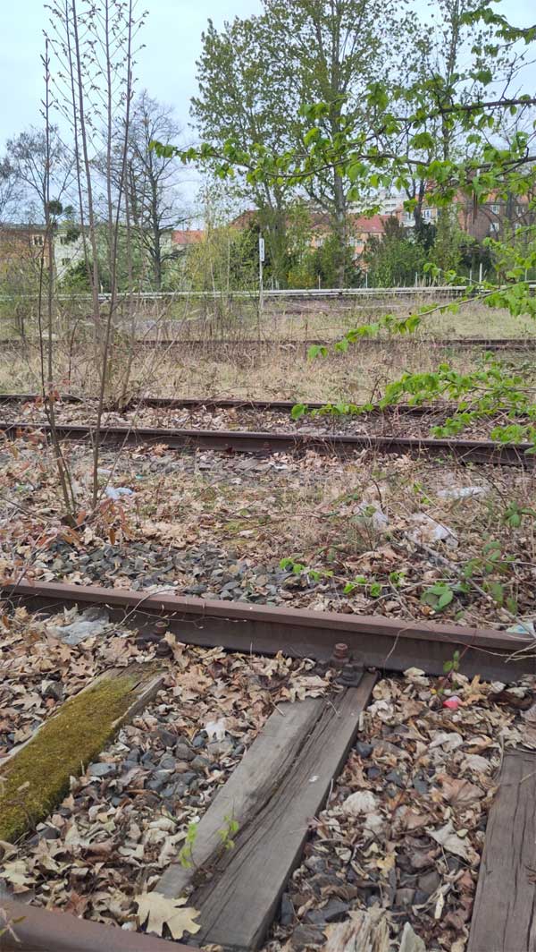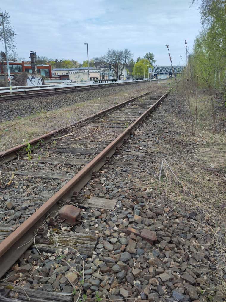 Nachdem die Trasse die Berliner Stadtgrenze wieder überschritten hat, hat sich eine Eisenbahn-Landwirtschaft auf der Trasse breitgemacht. Relikte werden in den Gärten gepflegt.