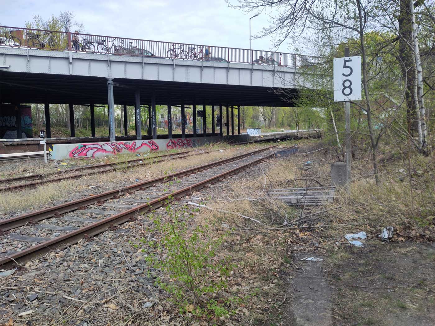 Links unter dem Durchgang ist km 17,0 der Wannseebahn zu erkennen.