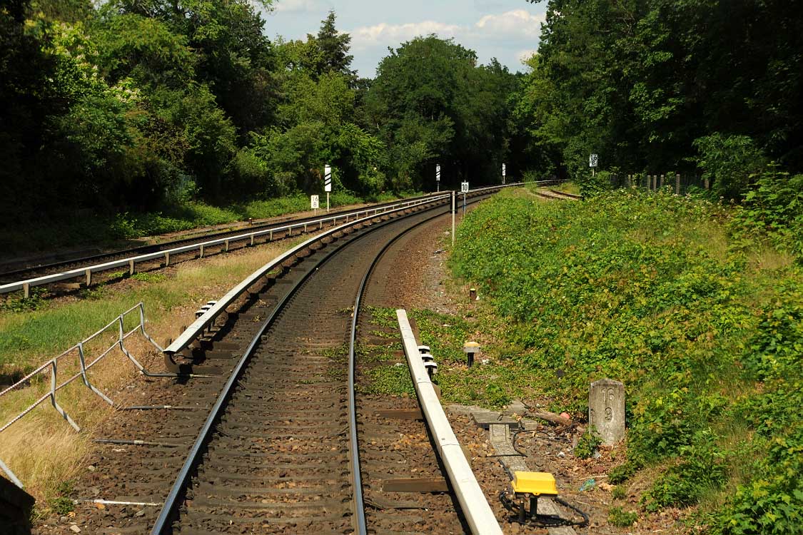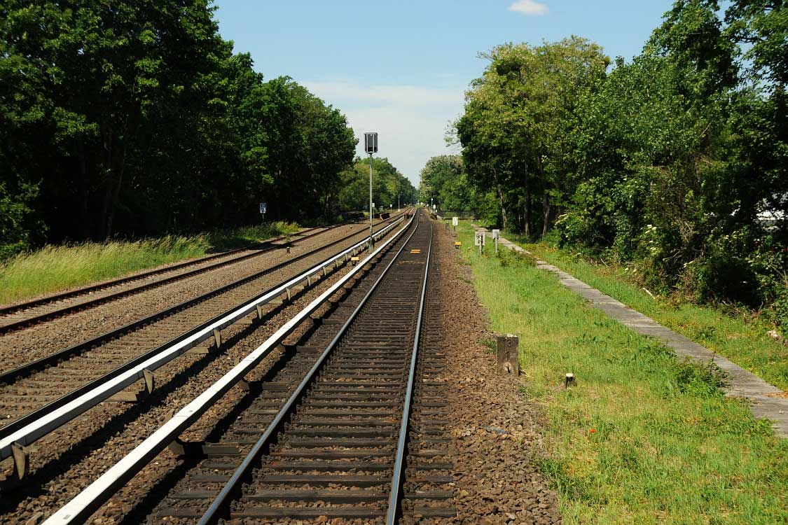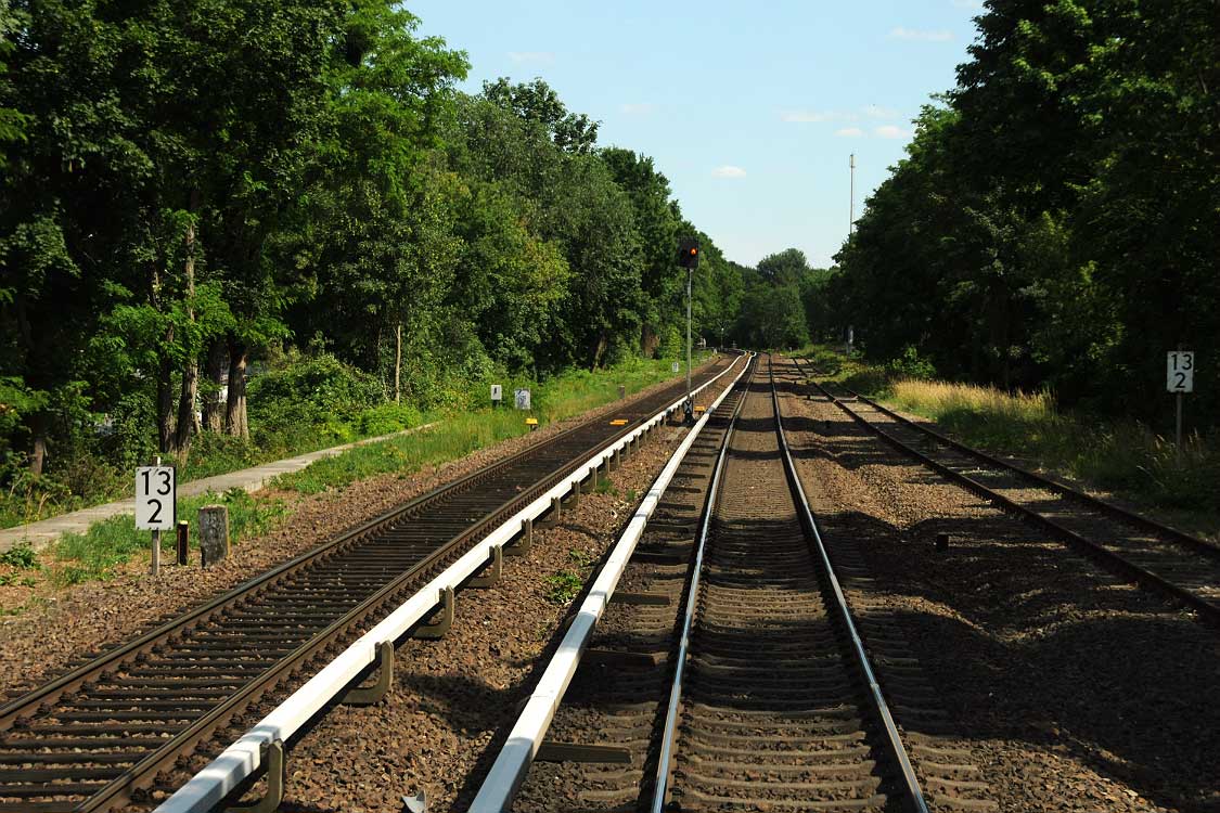Blick Richtung Berlin-Zehlendorf km 13,0 (Tafel) und km 13,1 (Stein) gehören zur Wannseebahn