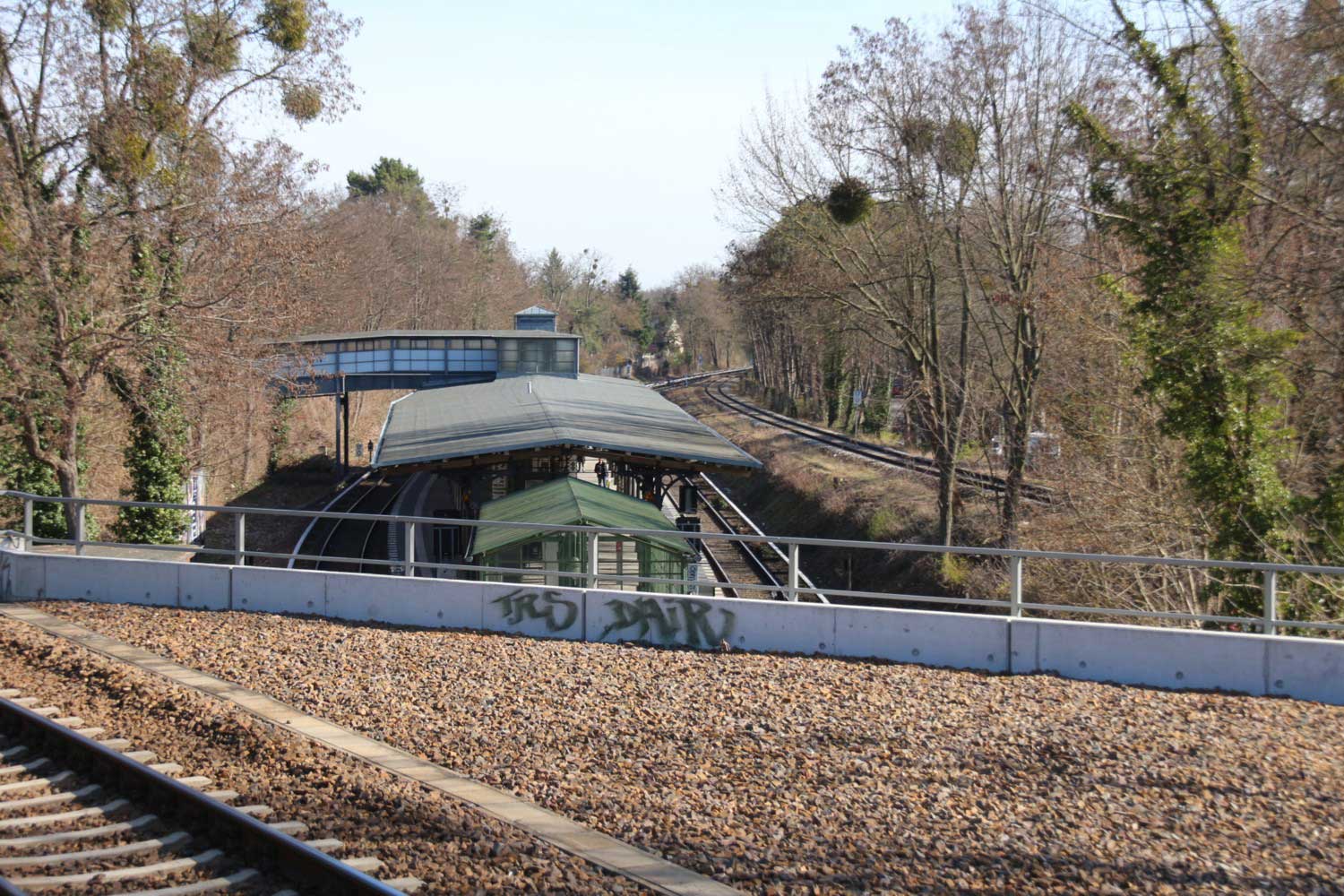 Unten der Bf Nikolassee (Wannseebahn) Links unter dem Durchgang ist km 17,0 der Wannseebahn zu