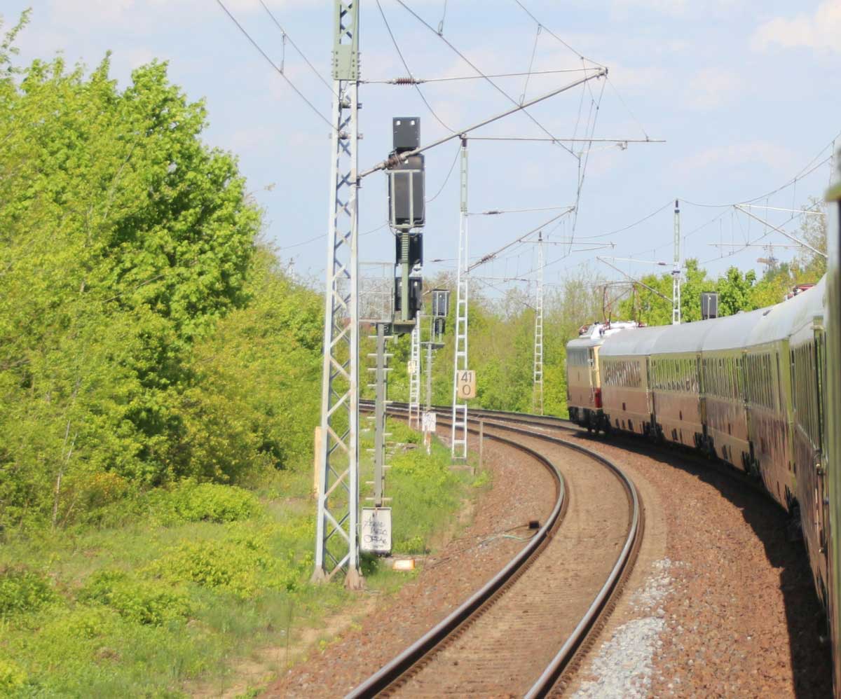 Halb rechts ankommend das Gegenrichtungsgleis (lange Kurve) der Strecke