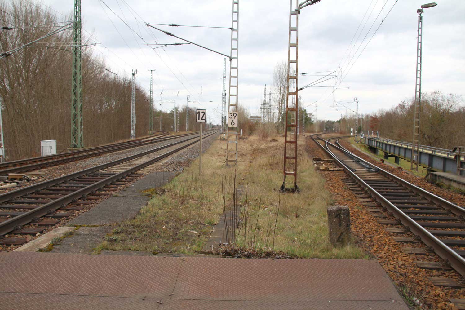Ganz links ankommend das Richtungsgleis (kurze Kurve) der Strecke