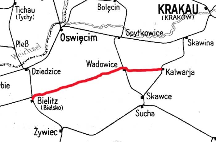 Kalwaria Zebrzydowska Lanckorona (Kalwaria Landskron) 0,0 - Wadowice (Wadowitz) 17,483 - Bielsko-Biała Główna (Bielitz Hbf) 58,463