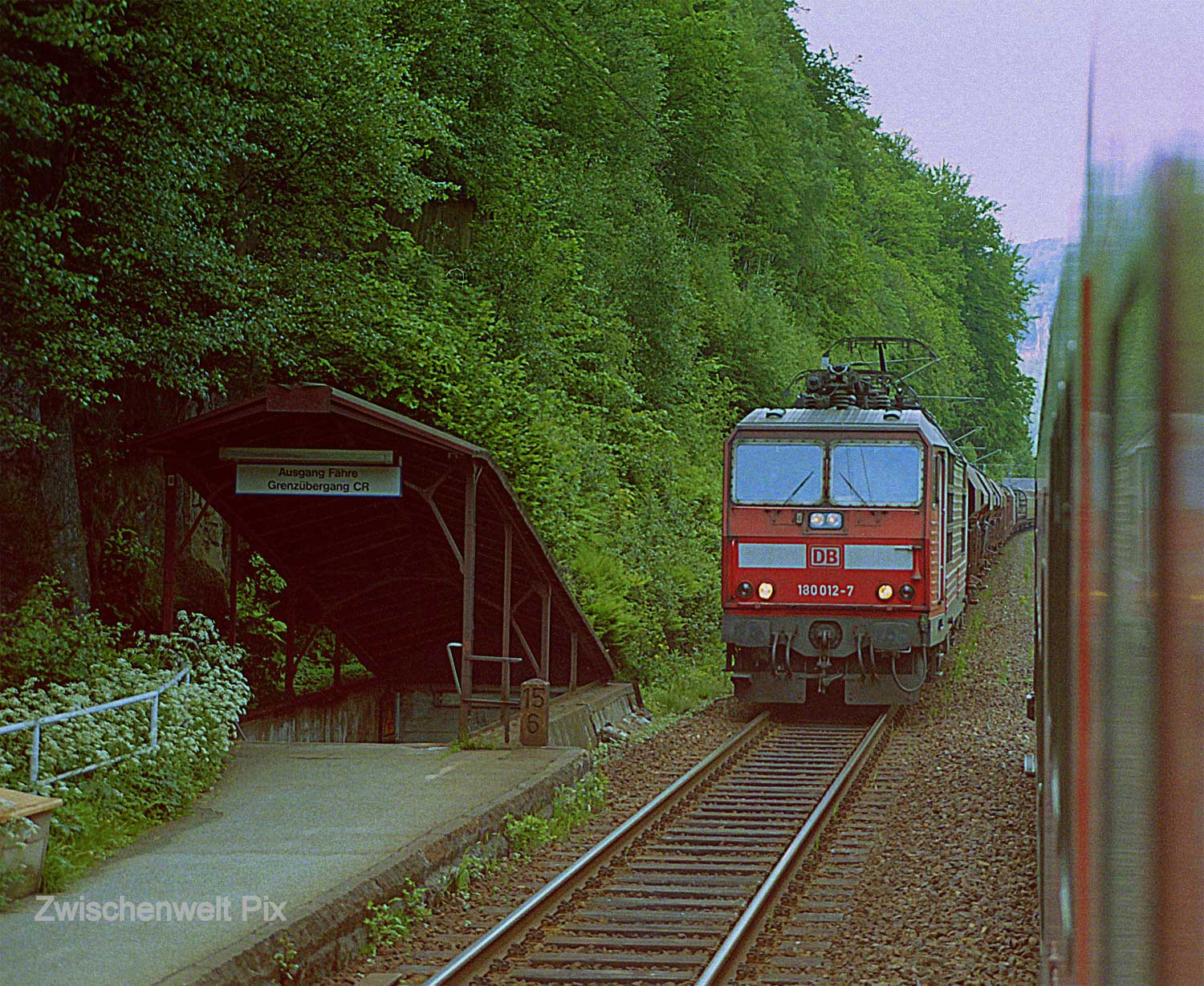 Mittelgrund | 3,71 | km 459,206 der Strecke Wien Nordwestbf 0,0 - Zellerndorf 73,675 - Retz 81,397 - [Staatsgrenze Österreich/Tschechien 87,660] - Schattau (Šatov) 89,139 - Znaim (Znojmo) 100,149 - Mährisch Budwitz (Moravské Budějovice) 138,466 - Iglau (Jihlava) 198,608 - Deutschbrod (Havlíčkův Brod) 224,108 - Kolin (Kolín) 298,300 - Nimburg Hbf (Nymburk hl. n.) 322,663 - Lissa an der Elbe (Lysá nad Labem) 337,602 - Wschetat (Všetaty) 360,997 - Melnik (Mělník) 371,715 - Leitmeritz unt. Bf. (Litoměřice dolní n.) 406,532 - Aussig-Schreckenstein (heute: Ústí nad Labem-Střekov) 431,113 - Tetschen Nordwestbf. (Děčín východ dolní n.) 456,872 - Mittelgrund (Děčín-Prostřední Žleb) 459,206 [= km 4,070 der Strecke Bodenbach (Děčín hl. n.) 0,548 - Dreden-Neustadt 66,33 (BD)] |