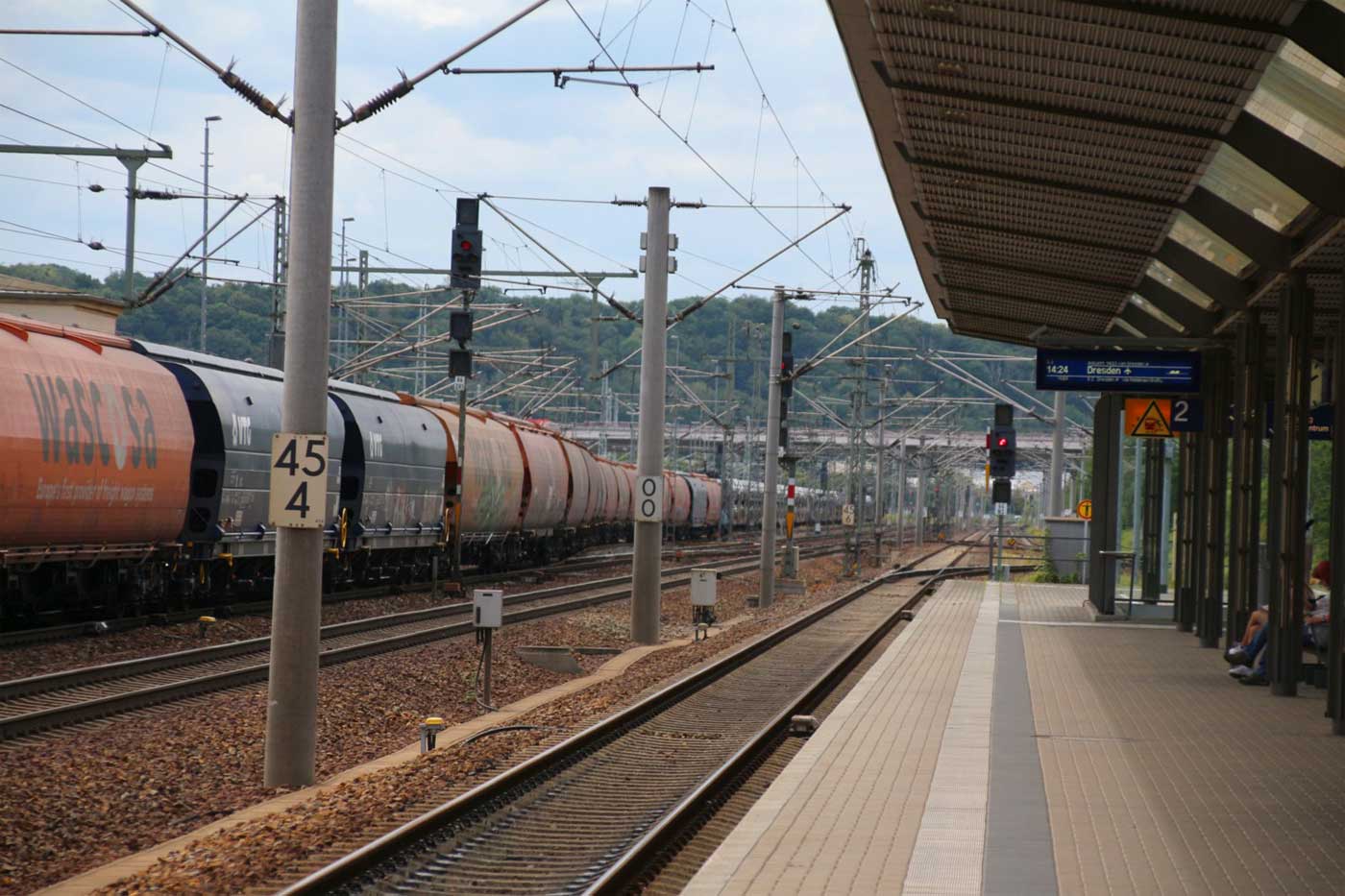 bei km 64,7 (Gleis am Bahnsteig) zwischen Dresden Hbf und Dresden Neustadt in Dresden Mitte - Blick Richtung Děčín hlavní nádraží (Bodenbach)