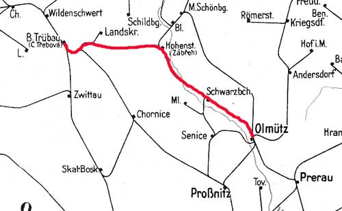 Böhmisch Trübau (Česká Třebová) 0,0 - Hohenstadt an der March (Zábřeh nad Morave) 41,33 - Olmütz Hbf (Olomouc hl. n.) 86,84 (1943)