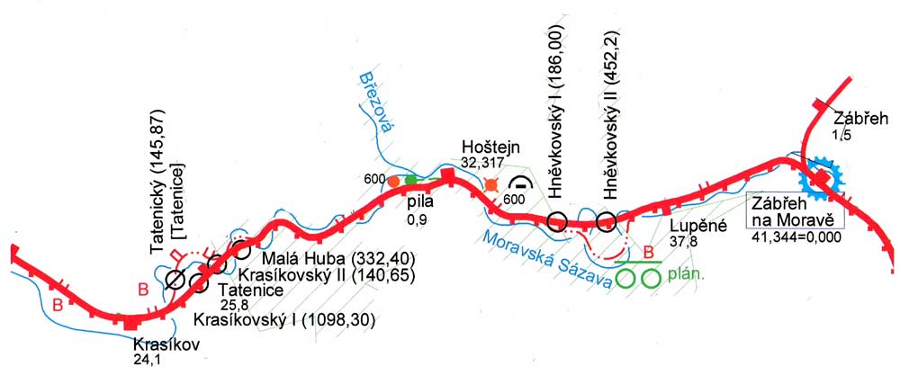 Česká Třebová osobní n. (Böhmisch Trübau) 0,206 - Zábřeh nad Morave (Hohenstadt an der March) 41,344 - Olomouc hlavní nádraží (Olmütz Hbf) 86,840 (2008)